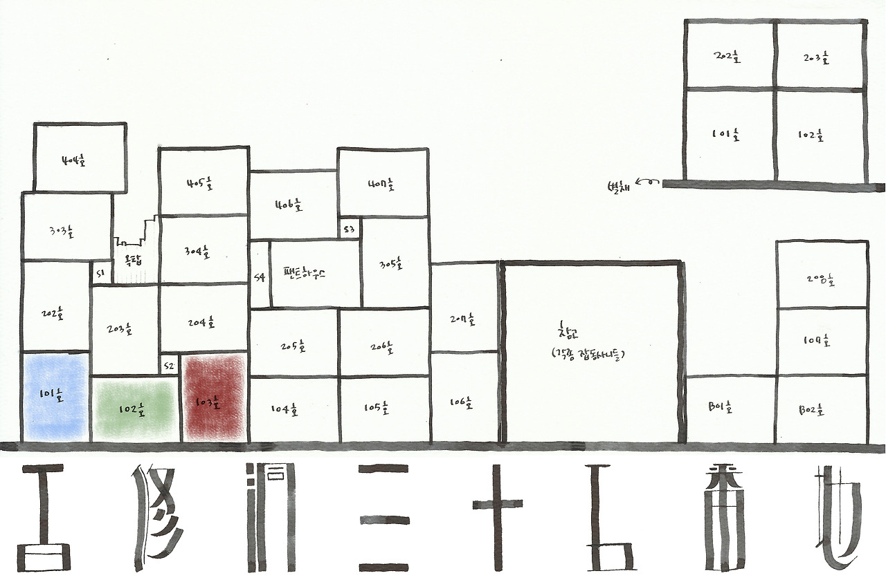 103호에는 문 역할을 하는 커다란 시계가 있다. 딱히 걸어둘 곳이 마땅치 않았고, 걸지 않으면 바닥에 두어야 했고, 그러자면 잘 보이는 바닥에 두어야 했는데 103호 앞에 맞춤했다. 시계는 동그랗고 초침 움직이는 소리가 제법 크다. 어쩌다 바람소리도 없이 조용할 때면 째깍째깍 초침 소리가 온 건물을 울릴 정도다. 건물을 제 집처럼 드나드는 고양이 두 마리가 저희끼리 '우다다' 하느라 시계를 무너뜨리기도 하는데, 그렇지 않더라도 시계는 대개 조금 삐뚤어진 채로 103호의 문 노릇을 하고 있다. 문을 열듯 시계를 열고 들여다보면 103호는 좀 시끄러운 편이다.