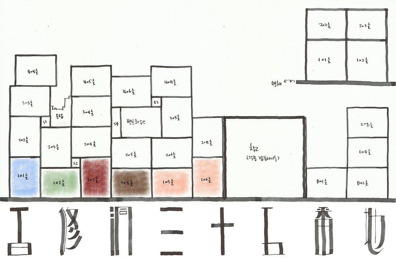 105호와 106호는 한집이나 마찬가지다. 이 건물에서 거의 유일하게 직접적인 교류가 이뤄지는 곳이기 때문이다. 이 교류는 먼발치에서 보아도 또렷이 보이는데, 여자는 이 ‘흐름’이 마냥 좋지만은 않아서 105호와 106호 앞에 가건물을 세웠다. 가건물━두 종류의 고양이용 스크래쳐━은 ‘행복’이라는 것이 도대체 어떤 감정인지 알 수 없어 난감한 여자가 단호하게 ‘백수동에서 가장 행복한 존재’라 일컫는 두 계절, 가을과 봄이 애용한다. 어쨌든,