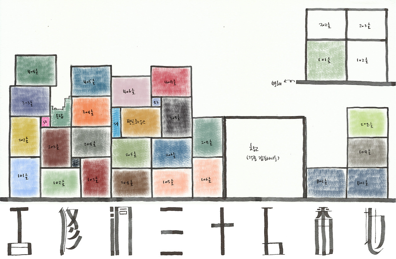 별채는 35번지 지형 때문에 어쩔 수 없이 따로 지어야 했던 건물이다. 어쩔 수 없이 지정된 변방에 단출하게 지어진 2층짜리 건물 첫 번째 객실에는 사람 대신 종이만 가득하다. 낱장으로 묶음으로 대강 섞여 쌓인 종이뭉치 사이에 바랜 사진첩 몇 권과 노트 서너 권이 끼어 있다. 제 역할이 무엇이든 개의치 않는 종이는 습기에 민감했고, 별채의 101호는 볕 들일이 없는 곳이었기 때문에 습지로 변해가고 있다.