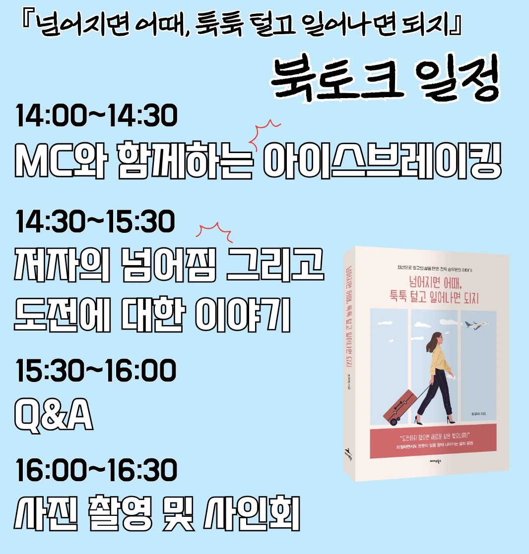 14:30~15:30 <넘어지면 어때, 툭툭 털고 일어나면 되지> 저자의 넘어짐 그리고 도전에 대한 이야기