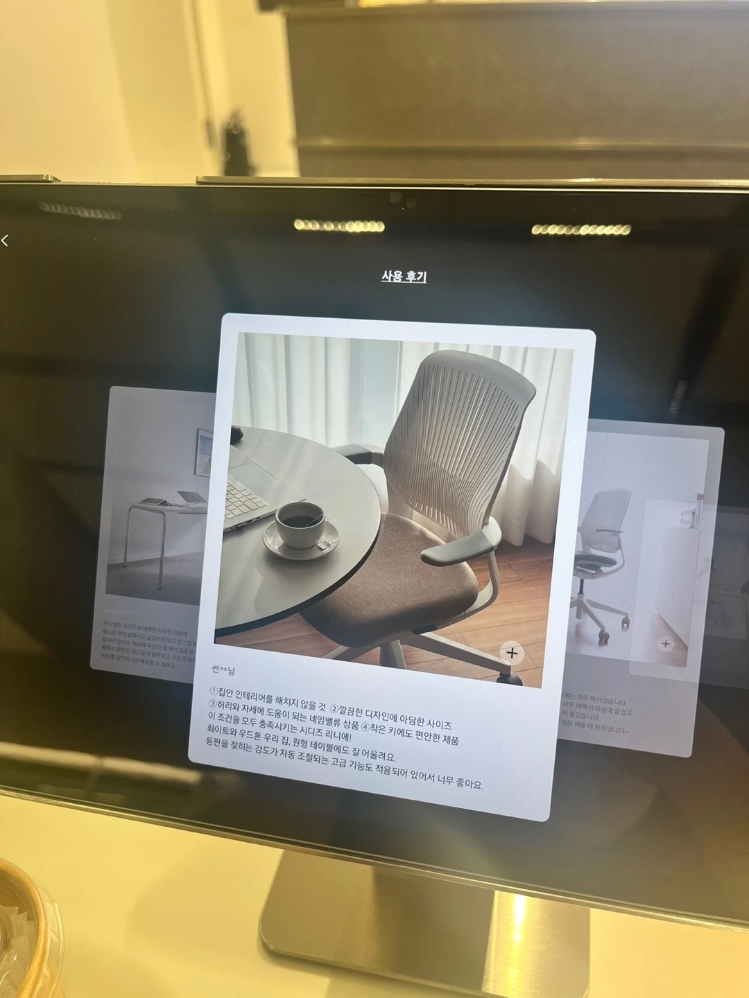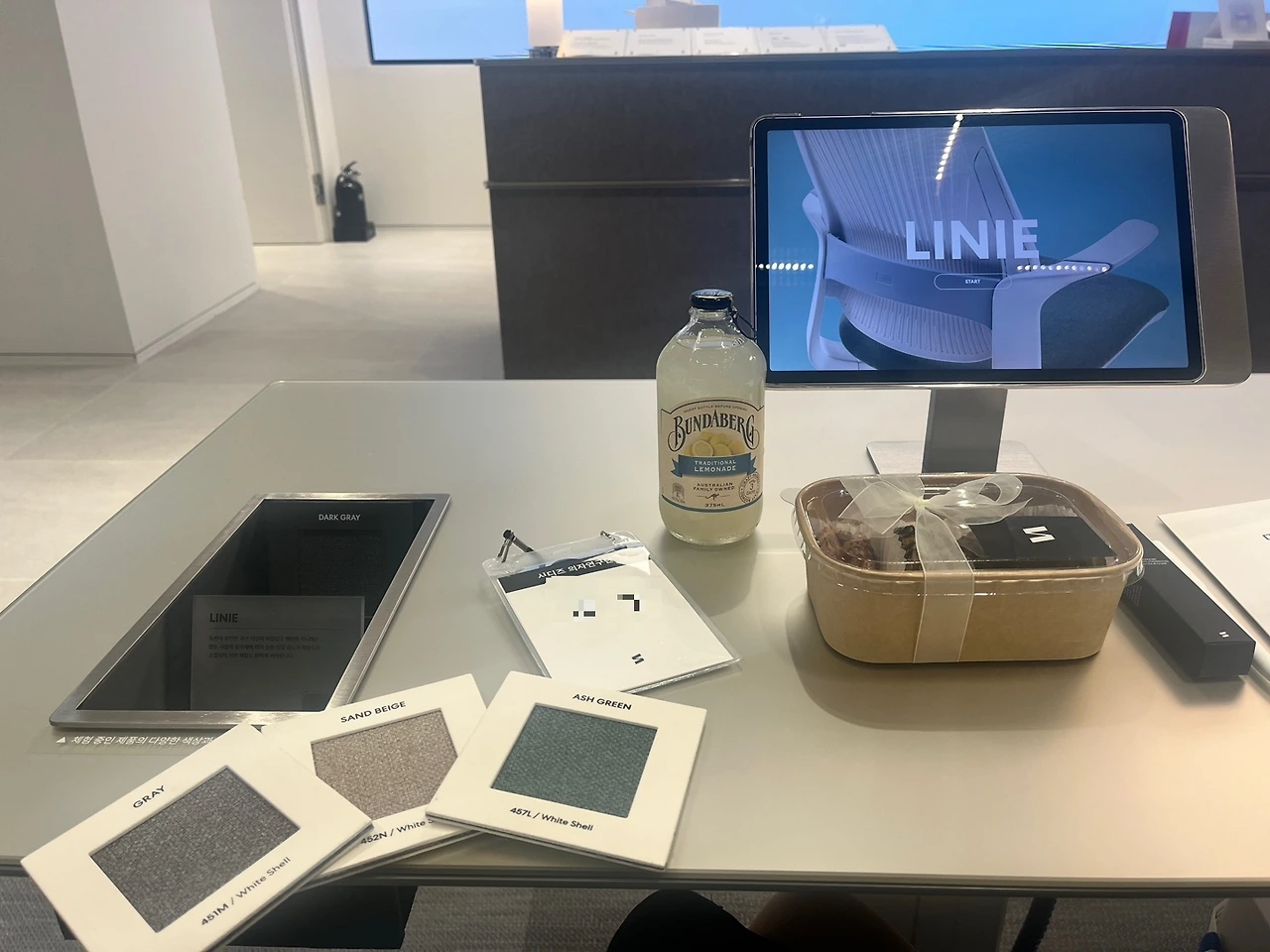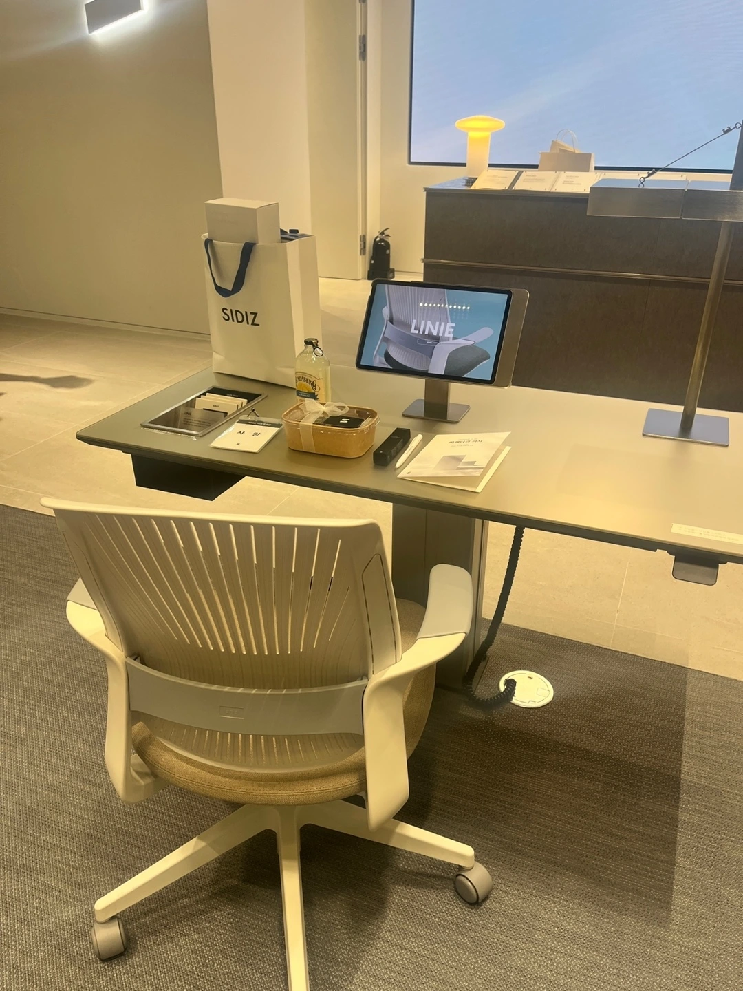 널찍한 공간에 들어서면 시디즈의 스테디셀러 'T90'부터 스툴 '펑거스'까지 시디즈의 베스트제품을 한눈에 조망할 수 있다. 교실처럼 책상과 의자가 카운터 방향으로 정렬되어 있는 것도 특이했지만 자리마다 의자가 모두 다른 것이 인상적이었다. 특히 좋았던 건 책상에 설치된 태블릿 PC였다. 내가 앉아있는 의자의 영문이름이 크게 적힌 태블릿 PC를 클릭하면 내가 선택한 의자의 소재와 특장점부터 가격, 프로모션까지 한눈에 확인이 가능하다. 솔직히 일반인이 의자에 대해 안다면 얼마나 잘 안단 말인가. '의자알못'인 나도 태블릿을 통해 내가 선택한 의자인 '리니(LINIE)'에 대한 정보를 잔뜩 얻었다. 후일담이지만 실제로 앉아본 리니는 헤드레스트가 없고 등받이 각도까지 조절되는 것이 내 맘에 쏙 들었다.