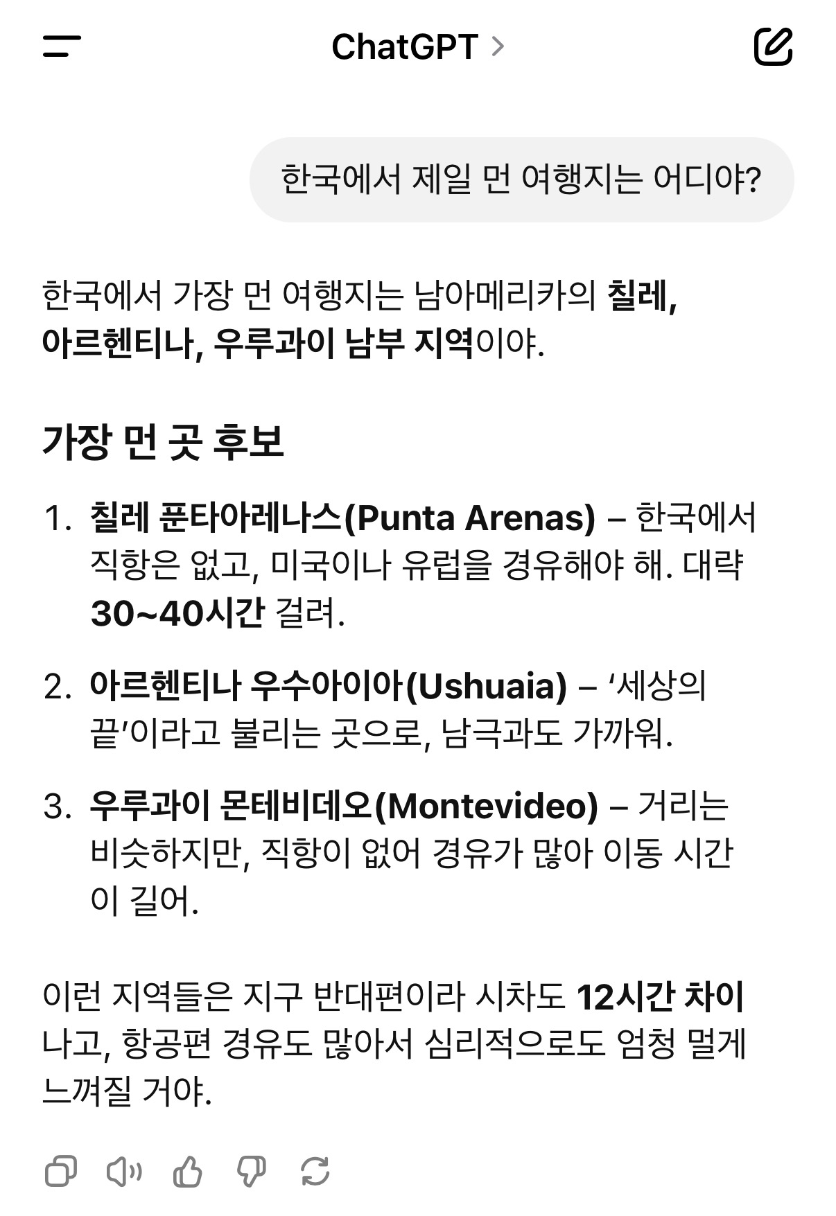 한국에서 가장 먼 여행지는 남미(칠레)이다. 편도로만 25시간에서 30시간 가까이 걸리기 때문에 남미 여행자는 한 도시, 한 국가만 둘러보지는 않는다. 한국에서 남미까지의 비행시간을 고려하면 간 김에 최대한 둘러보고 오는 게 이득이기 때문이다. 그러나 또 다른 맹점은 남미가 넓다는 것이다. 남미의 가장 북쪽인 콜롬비아에서 가장 남쪽인 칠레 푼타아레나스까지 비행기로 최소 10시간은 걸리니 남미 내에서의 이동이라도 많은 시간이 소요될 것을 예측할 수 있다. 남미 여행자의 다수가 한 달 이상의 장기 여행자인 이유이다.
