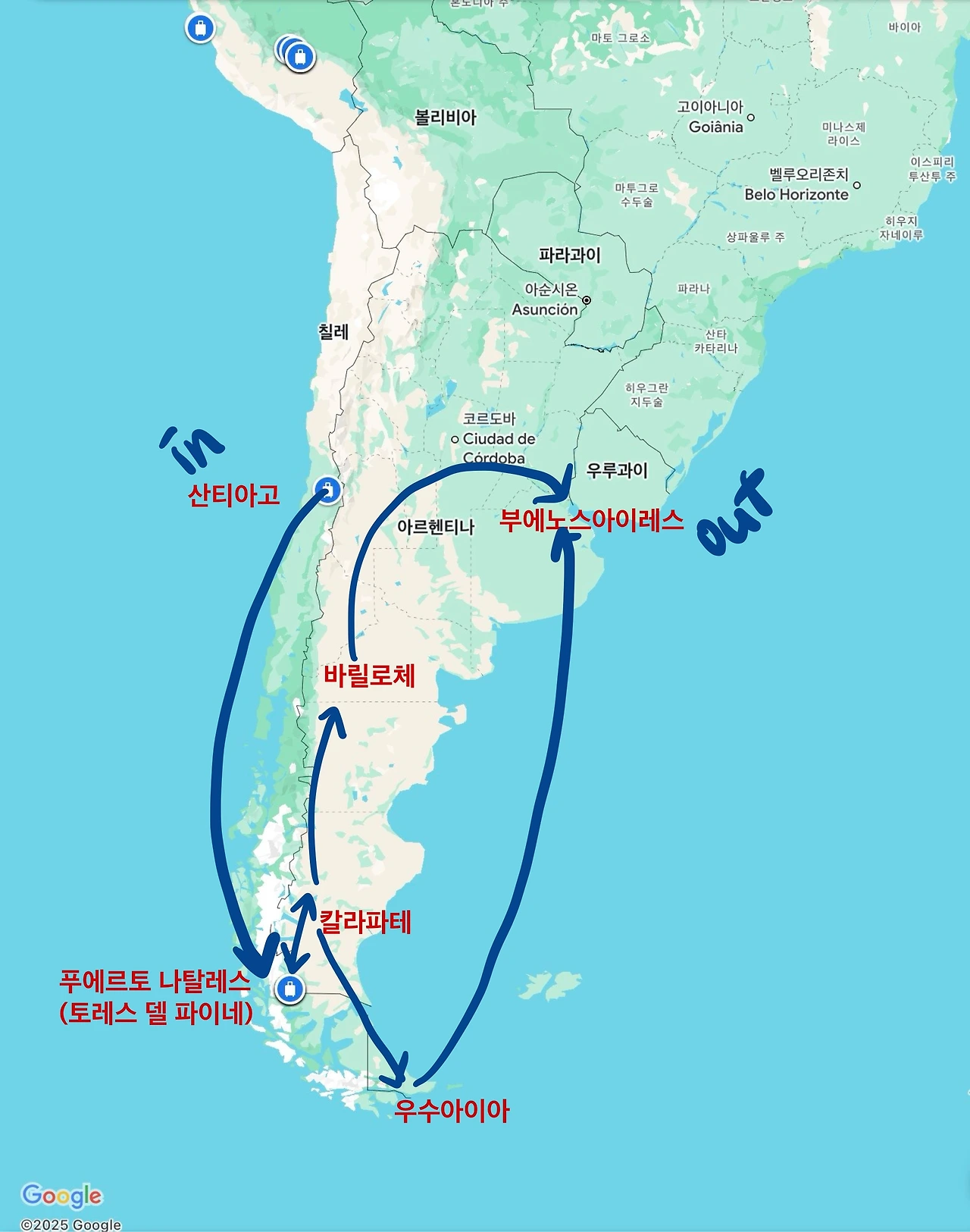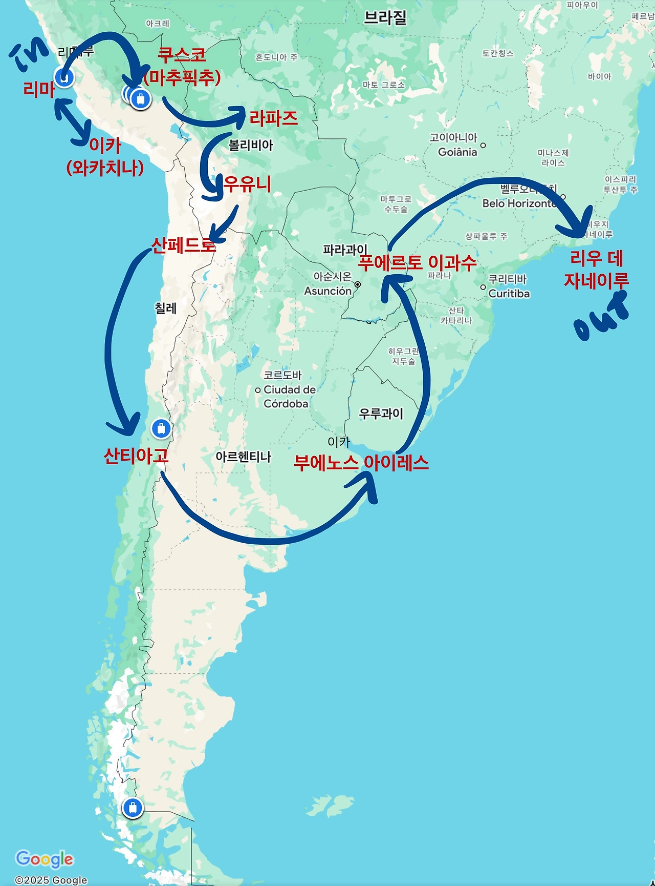 출국 전날 까지도 내 체력이 버틸 수 있을까 걱정이 많은 일정이었다. 남미 내 비행기 연착이 많다는 후기도 있었고 비행기 외에도 버스, 택시, 기차 등 무한 이동의 연속이었기 때문이다. 그러나 여행을 마치고 돌아온 지금(2025년 4월 2일)은 ‘이상한’ 루트일지 언정 우리가 가고 싶은 곳을 모두 보고 온 이 선택이 최선이자, 최고의 선택이었다고 자부한다. 그래서 이번 brunch book에서 이 14일간의 기록을 담아두려고 한다.