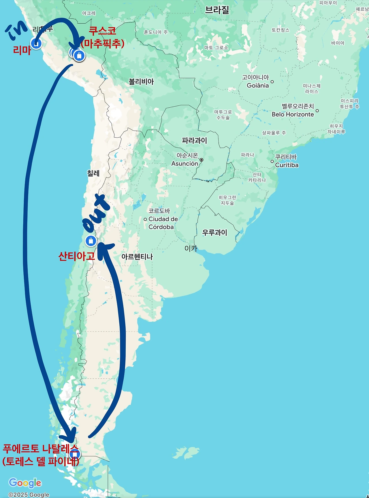 그렇게 우리의 여행루트는 아래와 같이 정해졌다. 그림에서는 쿠스코에서 푸에르토 나탈레스까지 한 번에 이동한 듯 보이지만 산티아고 환승(대기 시간 12시간^^)했으니 14일 동안 남미 대륙 내에서만 4번의 비행기를 탔다. 물론 인천 - 남미 왕복 이동까지 고려하면 8번 비행기를 탄 것이다. 여행 기간 중 가장 크게 다툰 것이 산티아고 공항 대기 중이었던 건 지금 생각해도 당연했다.