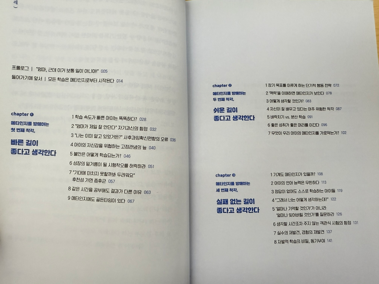 그래서 도서관에 가서 메타인지에 대한 책을 잔뜩 빌렸다. 그중 가장 도움을 받은 책이 <메타인지 - 생각하는 부모가 생각하는 아이를 만든다>이다. 특히 이 책의 목차가 그간 내가 가진 의문점을 모두 해소해주고 있다는 생각이 들었다. ‘메타인지를 방해하는 착각’이라니!
