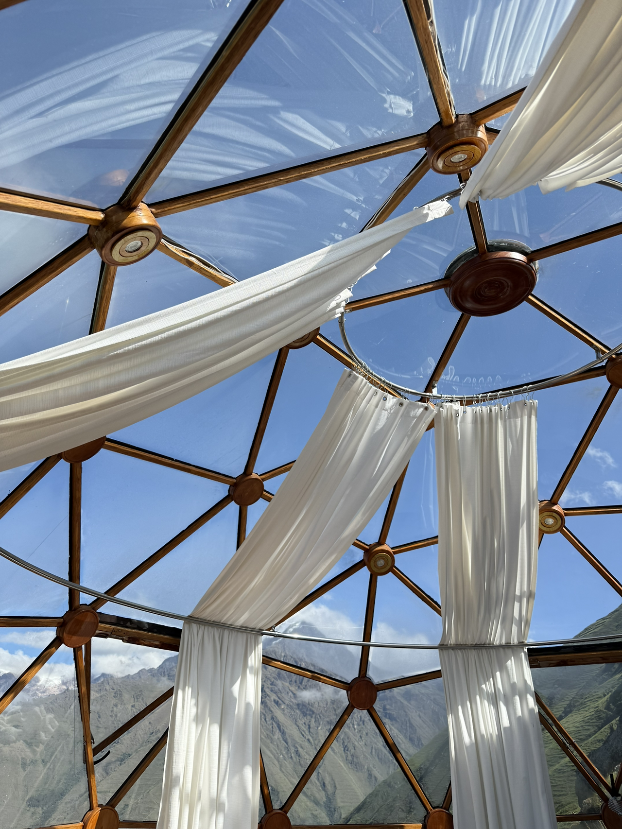 설레는 마음으로 마추픽추에서 내려와 숙소로 향했다. 영상처럼 ATV를 타고 올라가니 엄청난 풍경이 나타났다. 해발 4000m인 고지대 지역답게 옆에 있는 산맥들은 해발 6000m에 가까웠고, 산맥 사이로 보이는 길과 마을이 마치 레고 장난감처럼 보였다. 숙소에 들어서니 이글루 모양으로 이루어져 창문으로 하늘이 그대로 들어왔다. 밤에 이 창으로 별을 볼 생각에 설레었다. 공간이 넓지는 않았지만 침대와 화장실로 깔끔하게 구성되어 나쁘지 않았다!