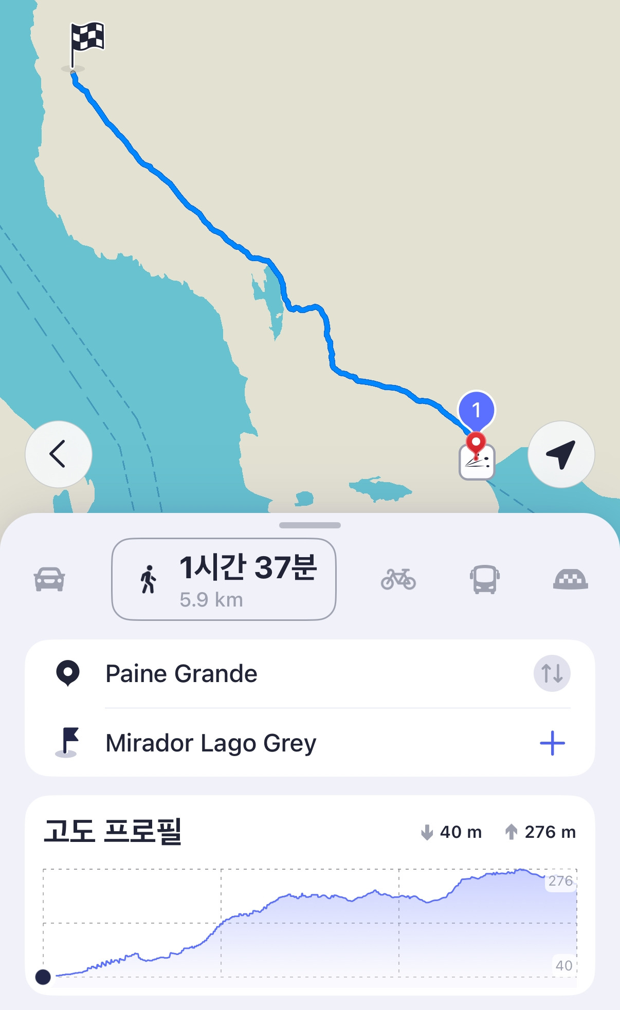 걷는 내내 이 생각이 들었다. 주위의 모든 사람이 나의 1.5배에 달하는 속도로 나를 스쳐갔다. 위축되었다. 게다가 점심도 먹지 않아 점점 배가 고파오고 머리가 멍해져 갔다. 당연히 지도에 안내된 시간(1시간 37분)은 우리의 목표에 도달하기에 너무도 부족한 시간이었다. 거의 두 시간 넘게 걸어 mirador lago grey에 도착했다.