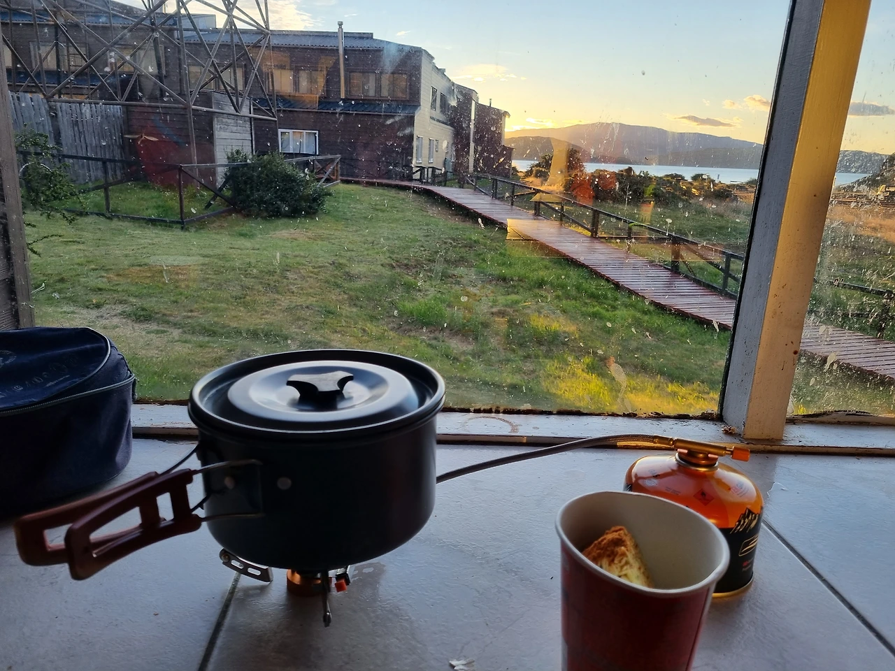 트레킹을 마치고는 곧바로 식당을 향했다. 무릎 통증보다 배고픔의 해결이 더 시급했다. 한국에서 고이 모셔온(그간 배낭에서 꽤나 큰 무게를 차지했던) 오뚜기 청주식 김치찌개를 버너에 데웠다. 누룽지 3개를 넣어 배부르게 먹고 나니 창밖의 아름다운 노을이 눈에 들어왔다.
