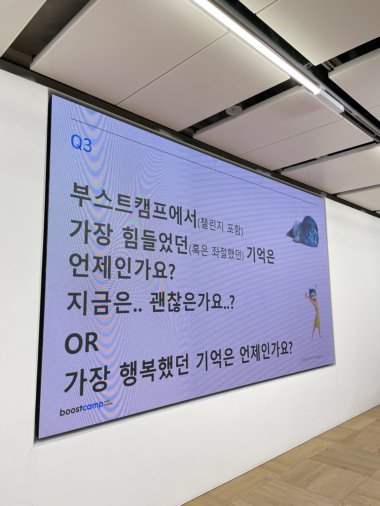 네트워킹 세션에서 고른 질문 중 마지막 질문은 6주 차 주간 학습 피드백을 보고 만들었다. 캠퍼들이 꽤나 지쳐있는 거 같아서, 혼자 지친 것이 아니라는 것을 함께 이야기 나누며 느끼고 힘을 얻어가기를 바라며 넣은 질문이었다. 혹 서로 너무 낯설어하면 어떻게 할지 걱정되었는데, 다행히 다들 너무나 즐겁게 참여해주었다. 1시간으로 충분하지 않았겠지만 서로 편히 이야기 나누고, 우리 모두가 부스트캠퍼라는 소속감을 느끼는 계기가 되었길!
