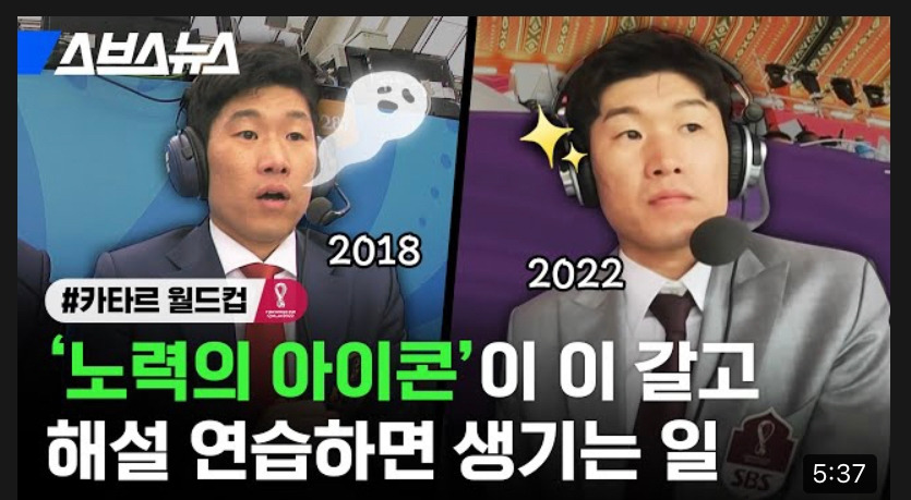 그렇게 2022년이 되었고, 얼마 전 우루과이전을 박지성의 해설로 들었다. 거슬리는 것이 하나도 없었다. 3명 해설이라 그런가? 싶기도 했지만 아래 영상을 보고 그의 노력의 결실을 볼 수 있었다.