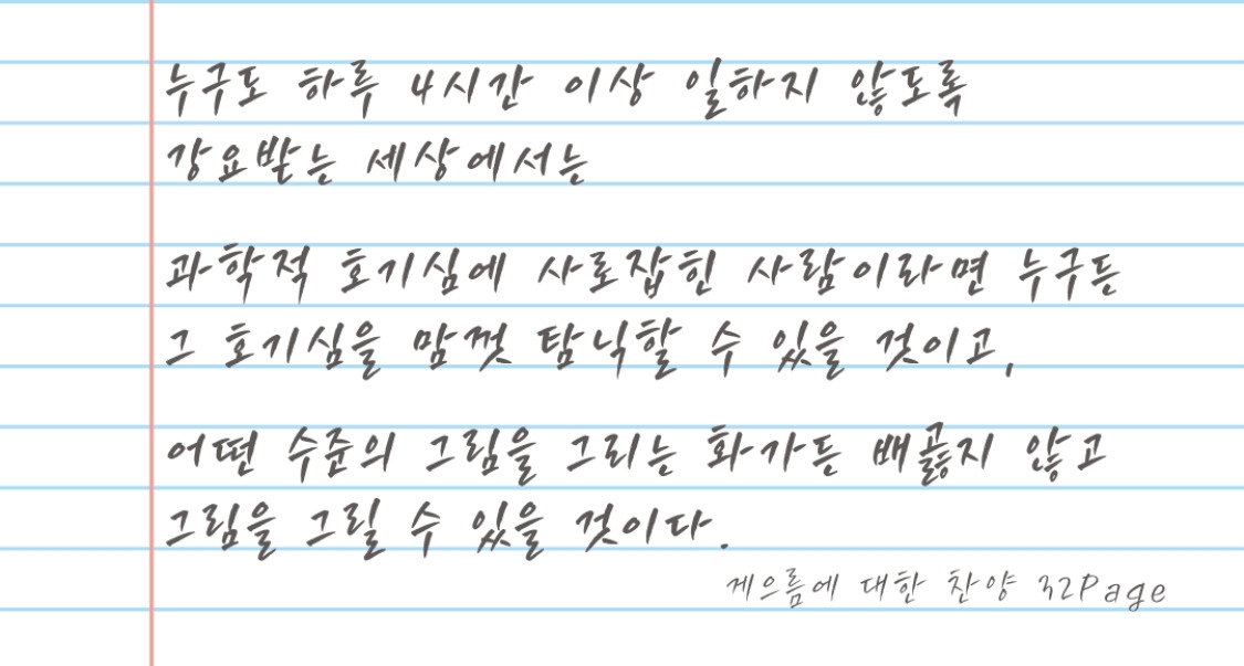 책을 읽으며 한 문장 한 문장에 진심으로 공감했고, 왜 이것이 실현되지 못할까에 대해 진지하게 생각했다. 나의 결론은 결국은 분배의 문제라는 것이다. 노동자로서 우리는 노동하지 않으면 최소한의 삶을 보장받지 못한다. 만약 당장 내일 직장을 잃으면? 나는… 게으름을 찬양할 새도 없이 새로운 직장을 찾기 위해 고민해야 한다. 내가 퇴사를 한 후 대학원이라는 선택을 한 것도 아무것도 하지 않는 백수에 대한 두려움이 있었기 때문이었다.