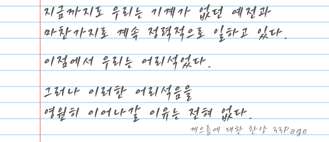심지어 기술은 점차 발전하여 우리의 일을 대신할 AI까지 있지 않은가? 나만이 아니라 모두가 함께 게으를 수 있는(행복할 수 있는) 방법이 있다 믿어본다.