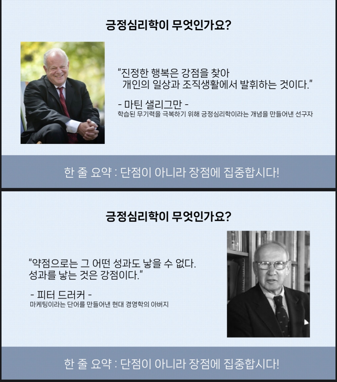 본격적인 워크샵을 진행하기에 앞서 MC님이 강점워크샵이 필요한 이유를 설명해 주었다. 진정한 행복은 강점에 집중할 때 실현될 수 있고, 약점을 강점으로 전환하거나 약점으로 성과를 내기는 쉽지 않다고 한다. 늘 약점에 더 집착해 온 나로서는 머리를 띵~ 하게 하는 설명이었다 ㅎㅎ.