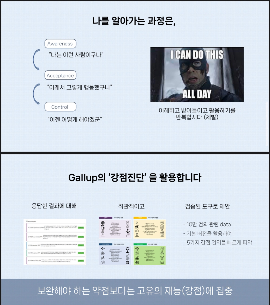 강점검사는 나를 알아가는 과정으로 나의 강점을 이해하고, 받아들이고, 통제하며 앞으로의 전략을 세우는 것이 효과적이라고 한다.