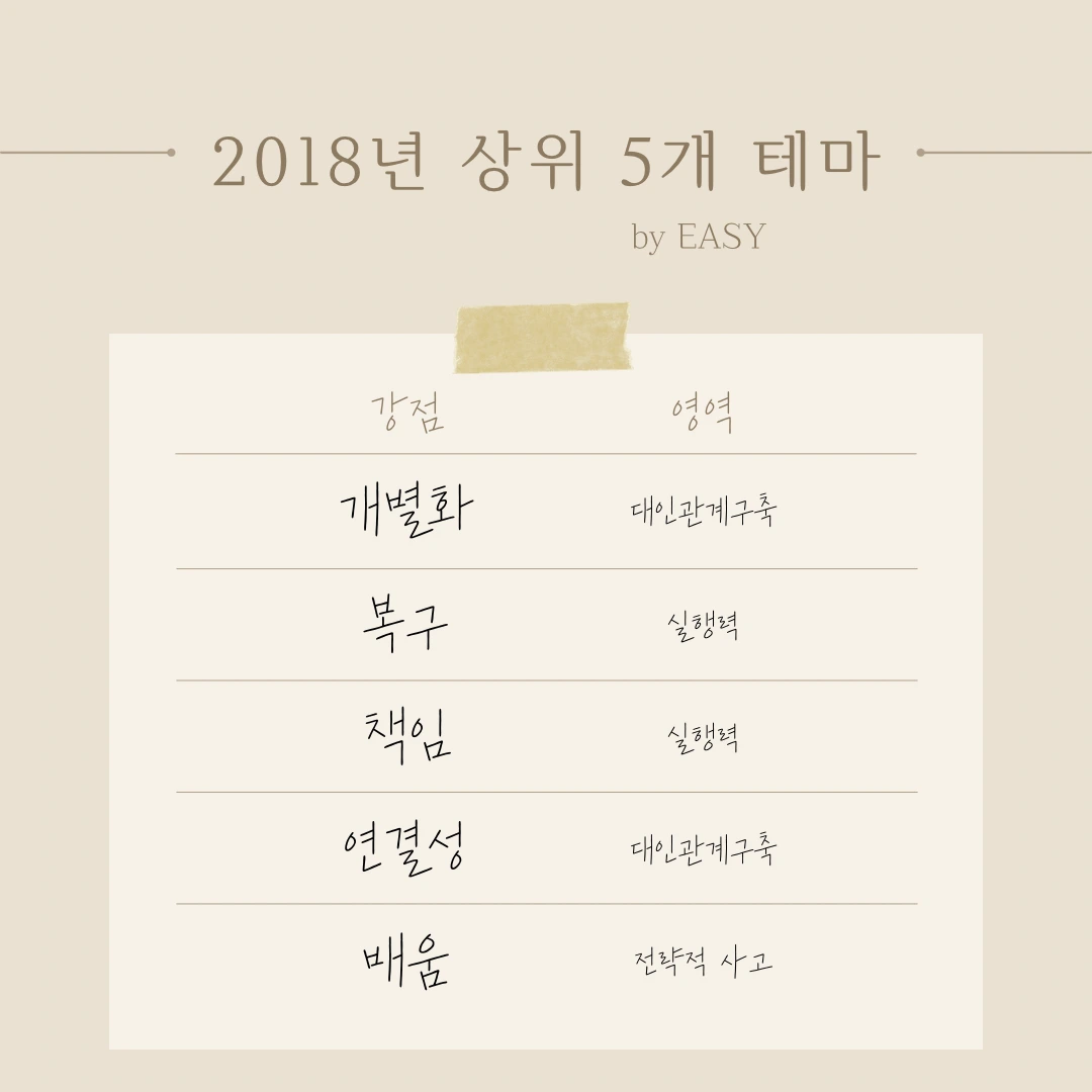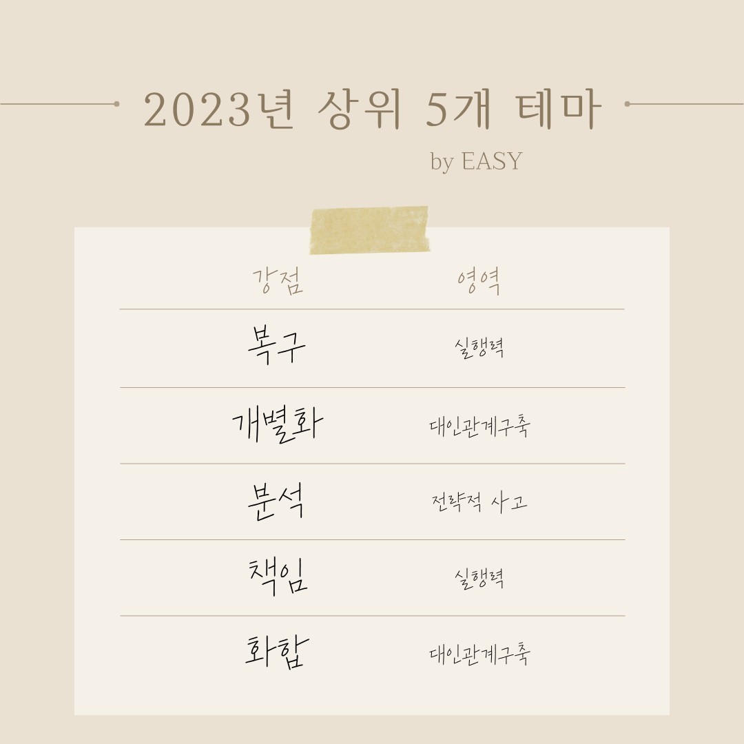 2017년 검사 결과지는 찾지 못해, 2018년과 2023년 결과만 정리해 보았다. 신빙성 있게 기존 결과와 비슷한 검사결과가 나왔다. 분석이라는 테마가 강점으로 추가된 것은 아마도,, 대학원의 영향은 아닐지 추측해 본다.