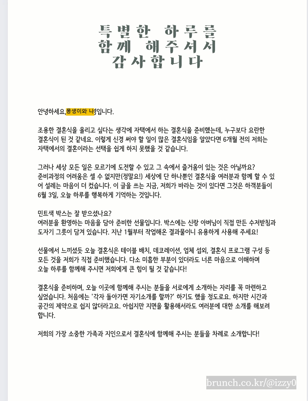 근데 정말이다 ㅎㅎ 우리의 결혼식이 자택에서 진행되어 그리고 우리가 직접 준비해서 우리만 할 수 있었던 것들이 있다.