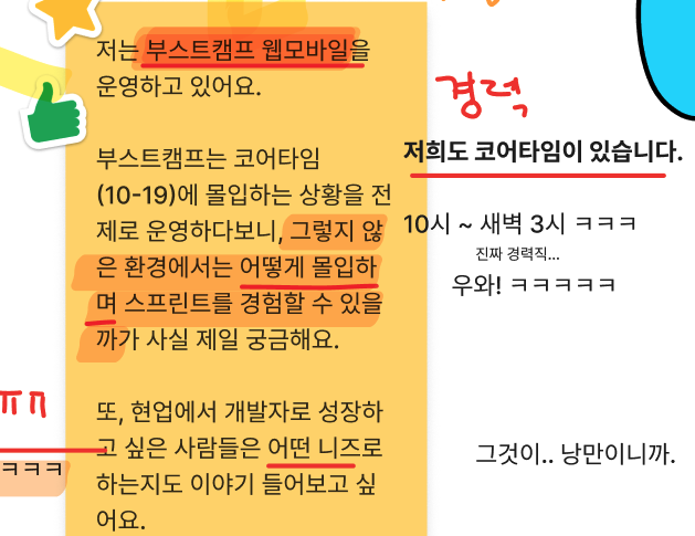 어색하게 서로의 호칭을 부르고, 실수로 ~님이라고 부를 때면 깜짝 놀라며 "죄송해요!"를 외치던 그들이 어느새 친해져서 다양한 짤을 남기며 드립을 치는 모습, 늦은 밤 회의에 지치다가도 기능에 대한 이야기가 나오는 순간 서로의 생각을 나누며 다시 깊이 있게 대화하는 모습 등 흥미로운 지점이 많았지만 그중 가장 흥미로웠던 지점은 누구나 길을 잃고 또 누구나 이 속에서 길을 찾아서 해결해 나간다는 것이다. 부스트캠프에서도 캠퍼들에게 늘 하는 이야기가 “정답은 없지만 해답은 있다.”인데 스스로의 해답을 찾아가는 과정을 지켜보는 것이 정말 흥미로웠다.
