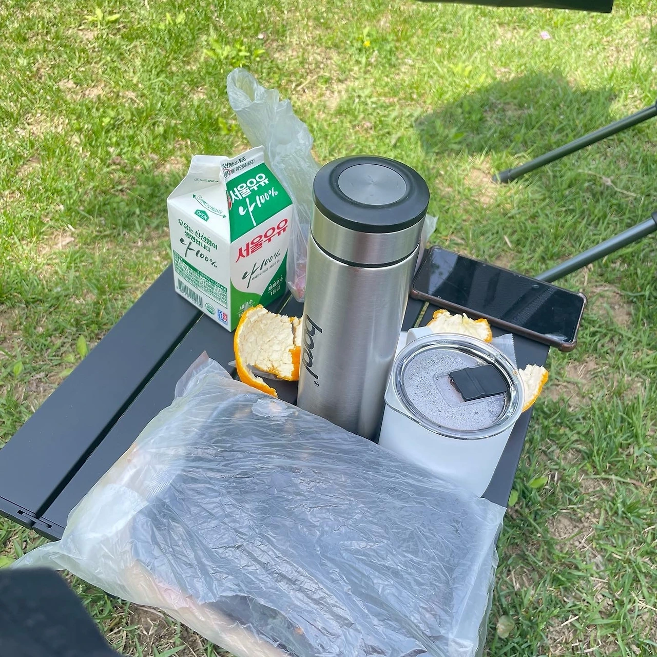 캠핑의자 2개와 작은 테이블, 집에서 내린 커피, 냉장고에 있는 과일, 고구마, 우유 등을 가지고 와서 우리집 테라스에서 먹는 주말 아침. 다소 정신승리, 자기 합리화 같지만 찐으로 좋다 ㅋㅋ