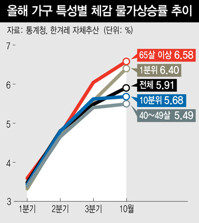 소득이 적을수록 인플레이션 타격이 크다. 소득 1 분위(하위 10%) 가구의 체감 물가상승률은 6.4%인데 반해, 소득 10 분위(상위 10%)의 체감 물가상승률은 5.68%였다. 특히 65살 이상의 경우는 가장 높은 물가 상승률을 체감했다. 나이나 경제적 상황에 따라서 물가로 인한 타격이 다를 수 있음을 나타낸다. 장기적으로는 우리나라 기초생활보장 급여의 비용도 올라갈 수밖에 없다.