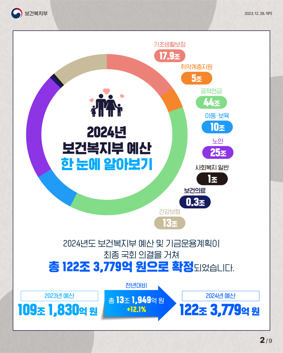 2024년 기준 총예산은 656.9조 원이다. 이 중에 보건복지부 예산은 122.3조 원으로 가장 비중이 높다. 하지만 기초생활보장과 공적연금, 노인, 건강보험에 예산이 편중되어 있다. 즉 대부분의 예산이 필수 돌봄과 연관되어 있다. 쉽게 말해 이 예산은 줄일 수도 없고, 줄여서도 안 된다는 뜻이다. 최저한의 인간다운 삶을 위한 최저한의 예산이다.