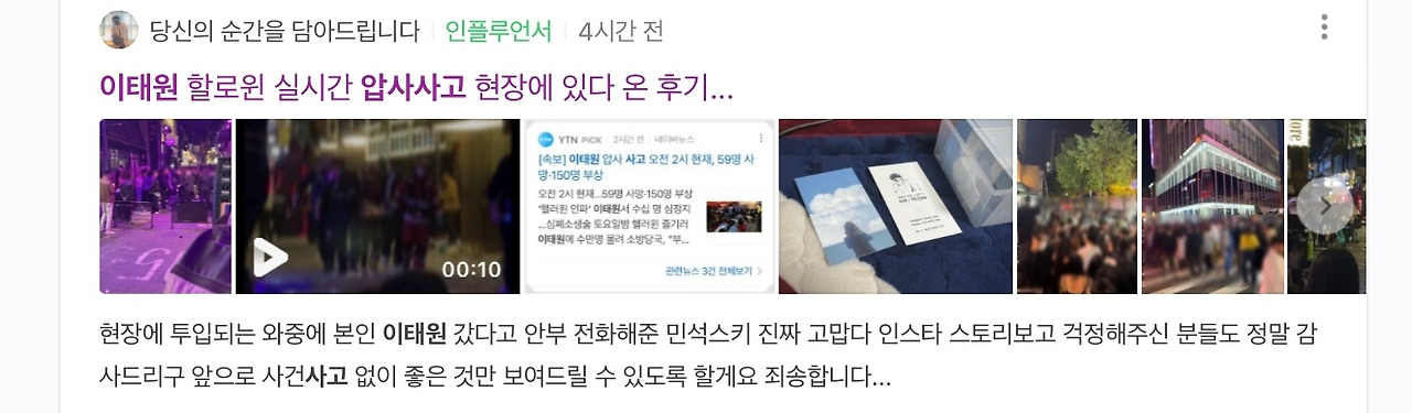 안타깝고 비통한 사고지만, 이 사고를 보며 통제가 무너진 상황이 사회 전체를 큰 혼란에 이를 수 있게 함을 알 수 있었다. 이 사태를 아침이 되어서 알게 되었지만, 사실을 파악하기 위해서 각종 방법을 통해서 찾다가 속 쓰린 사실들도 마주했다. 네이버 플랫폼에 인플루언서로 활동하는 사람은 본 사고를 마치 물건이나 콘서트와 같은 행사에 다녀온 후기처럼 게시하거나, 조회 수를 올리기 위한 자극적인 자목의 유튜브 동영상 게시물도 쉽게 찾을 수 있었다.