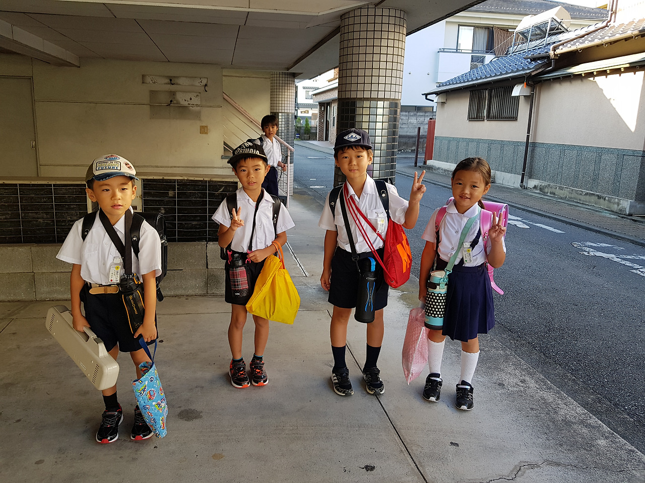 초등학교 아이들이 똑같은 복장에 똑같은 가방을 메고