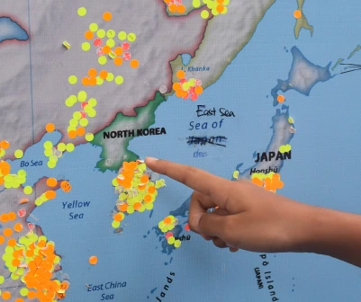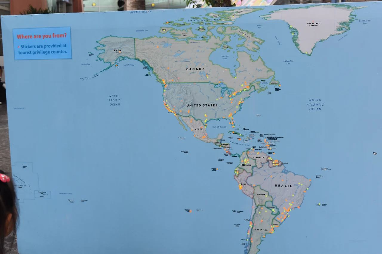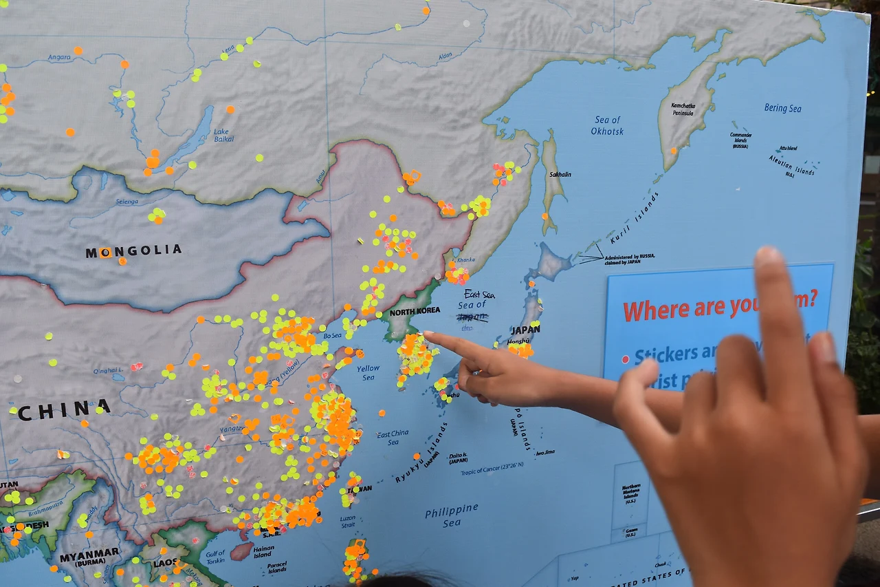 자신은 어디에서 왔는지 스티커로 표시해 둔 하드보드 판이 있어요