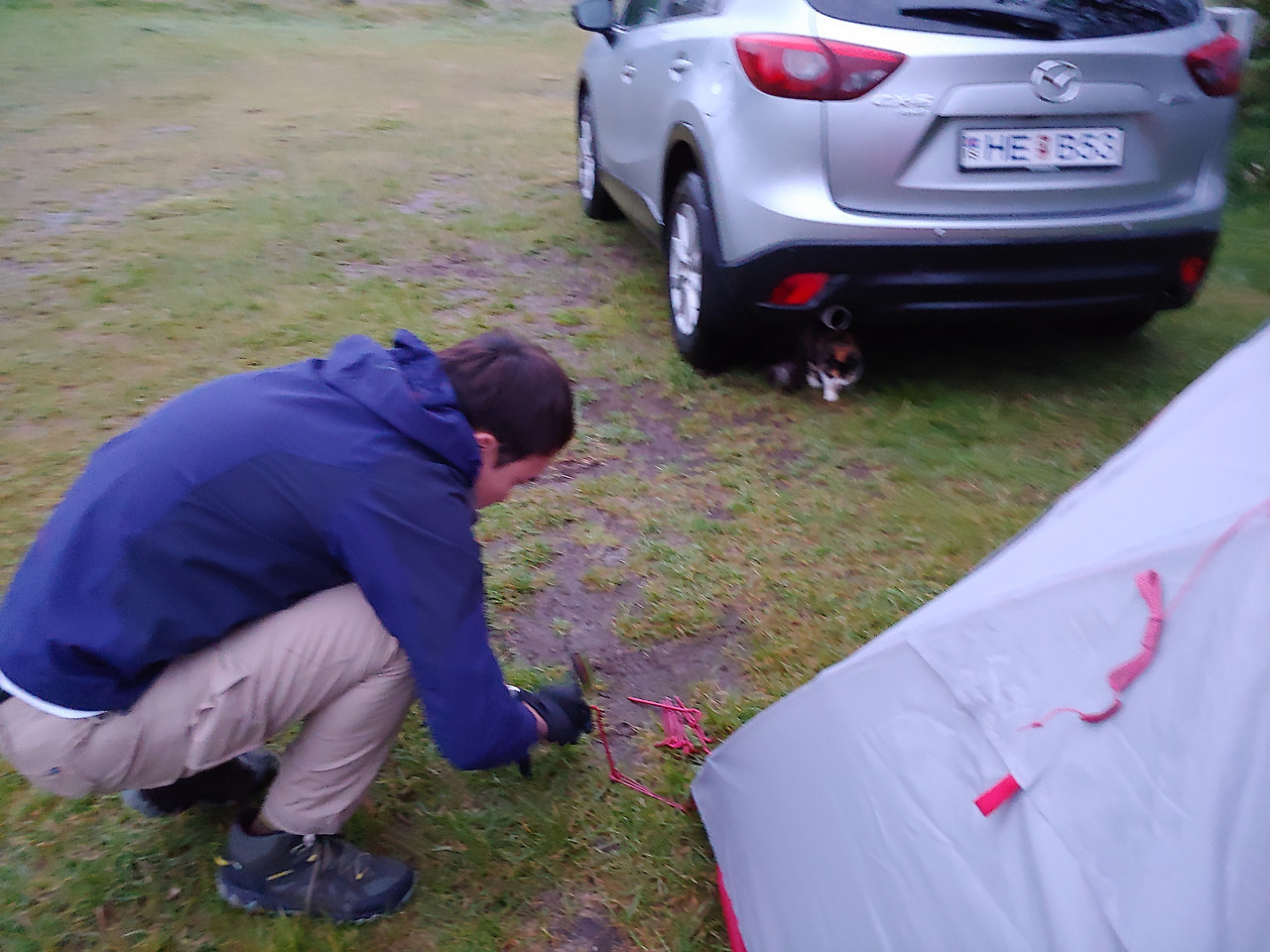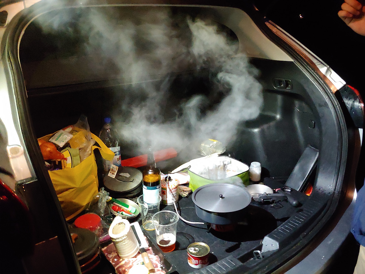 텐트를 치고 나니 밤이 되었다. 밤이 되니 깜깜해서 아무것도 안 보이고 비까지 오는데 전실이라곤 신발만 겨우 놓을 수 있는 작은 텐트를 치고 나니 저녁을 만들 공간이 없다. 어쩌지 고민하다가 트렁크에 있던 캐리어를 텐트 속에 넣고 간이 주방을 만들었다.
