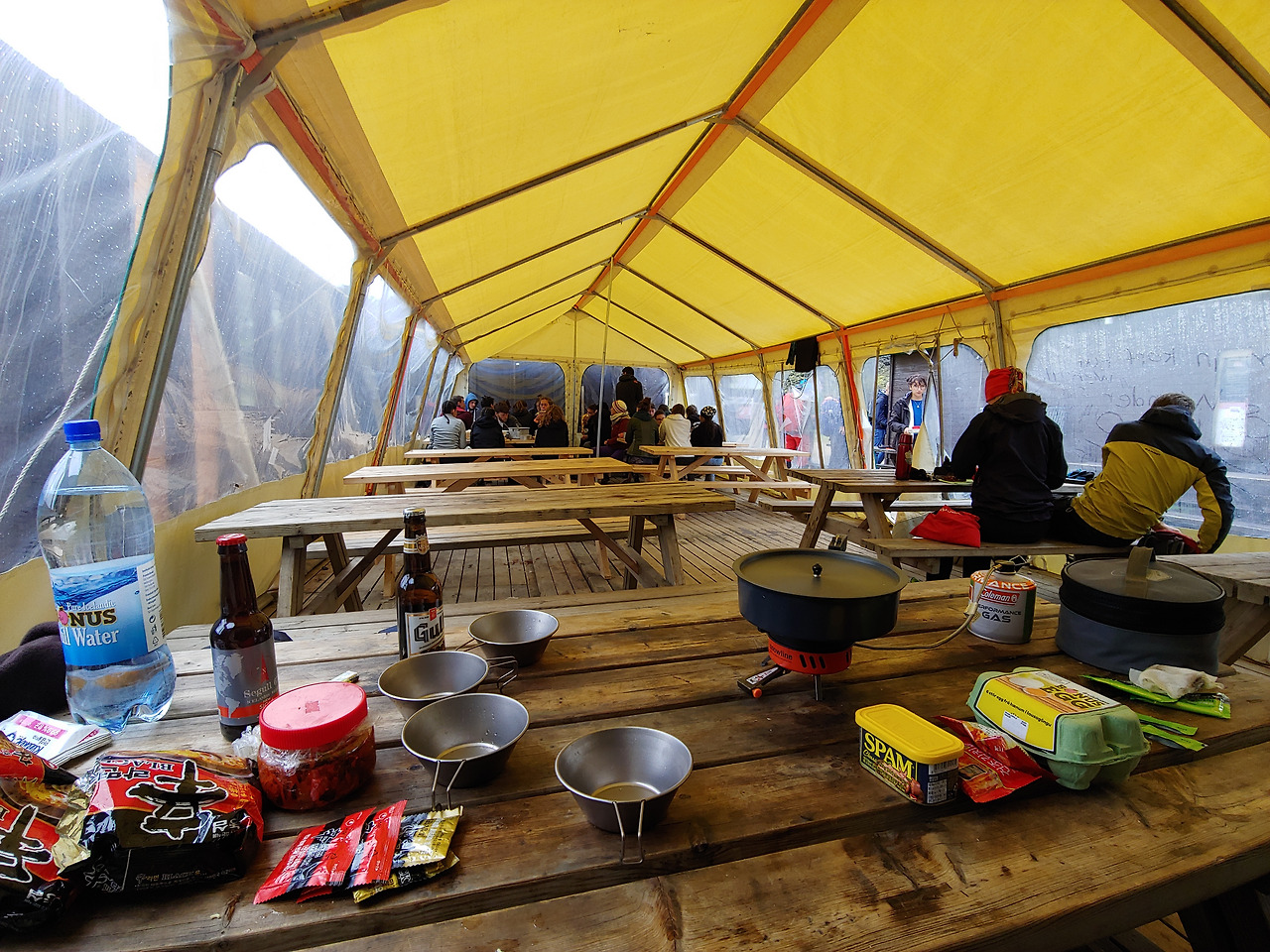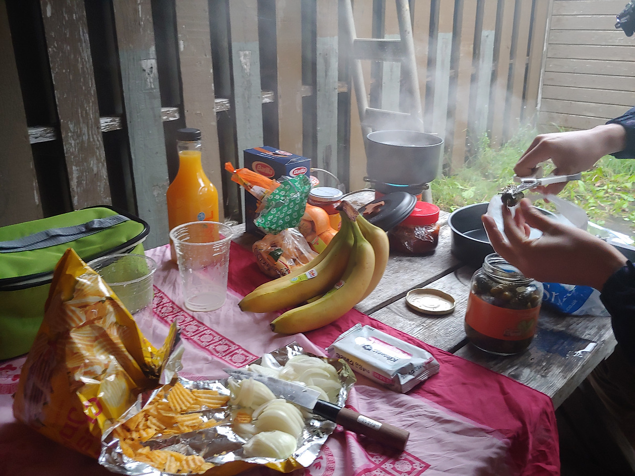 벌써 오후 두시가 넘어 주린배를 부여잡고 허겁지겁 점심식사를 준비했다. 란드마날라우가르 캠핑장은 따뜻하게 식사를 할 수 있는 커다란 공간이 있어서 가장 좋았다. 텐트앞에서 식사할수 있을줄 알고 테이블도 들고갔는데, 8월 말의 아이슬란드는 너무 추워서 전실이 없는 텐트에선 요리하기 힘들다.