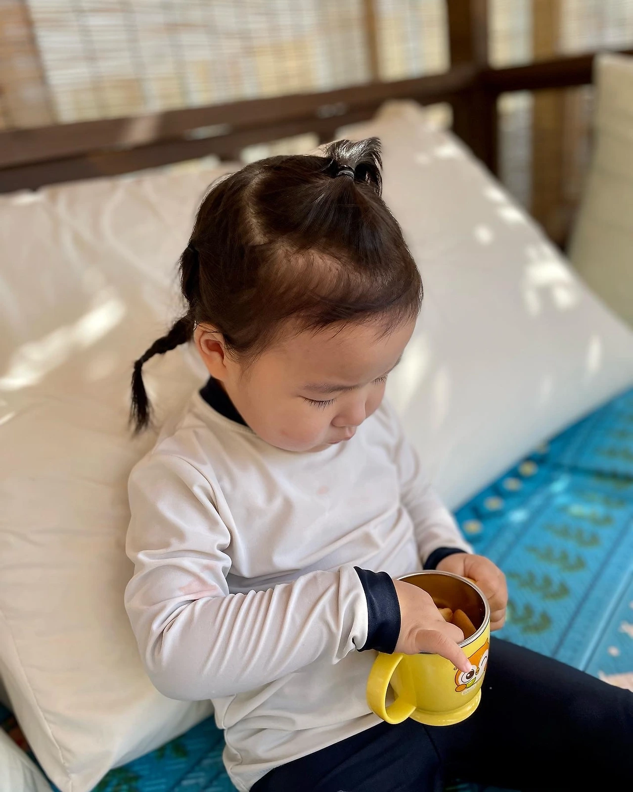 억울한 아이는 제 의사를 아빠에게 전달하지 못한다. 아이 몰래 뚜껑 달린 컵을 들어 남편에게 보여준다. 남편이 아이에게 다시 말한다. “뚝딱이 부엉이 컵 가져와. 아빠가 컵에 과자 담아줄게.”