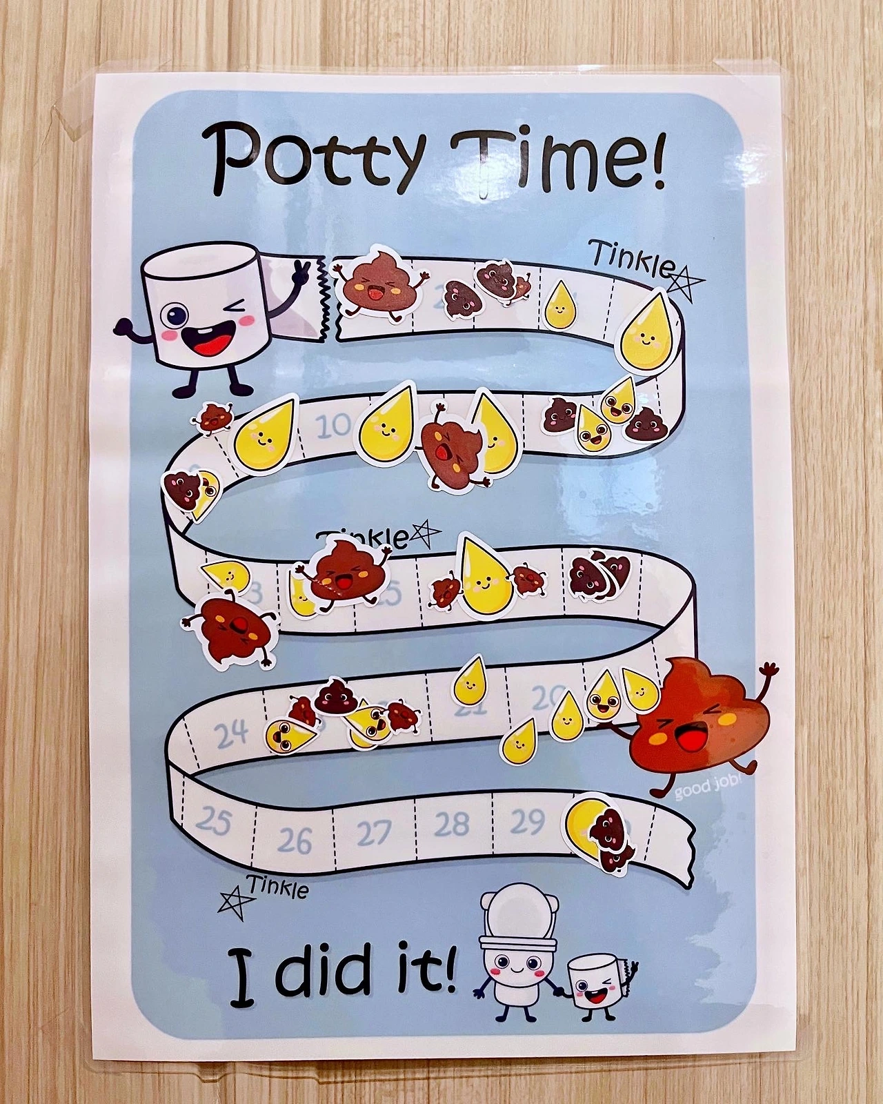 아무것도 하지 않기에는 마음 한구석이 찔려, 배변훈련 스티커판을 사다가 화장실 문 앞에 붙여뒀다. 긴 시간 기저귀가 젖지 않았으면 화장실에 가서 앉아보자고 하는데, 워낙에 거부가 심해 심리적인 문턱을 낮춰보고자 한 것이다. 스티커판 사진을 찍어 알림장에 올리니 선생님께서 집에 있는 것과 비슷한 모양의 스티커판을 원에도 붙여주셨다. 나한테 감사하다고 하시는데 면목이 없다. 우리 아이를 나보다 더 적극적으로 교육시켜주시니 그게 직업이라 해도 감사하고 송구스러울 따름이다.