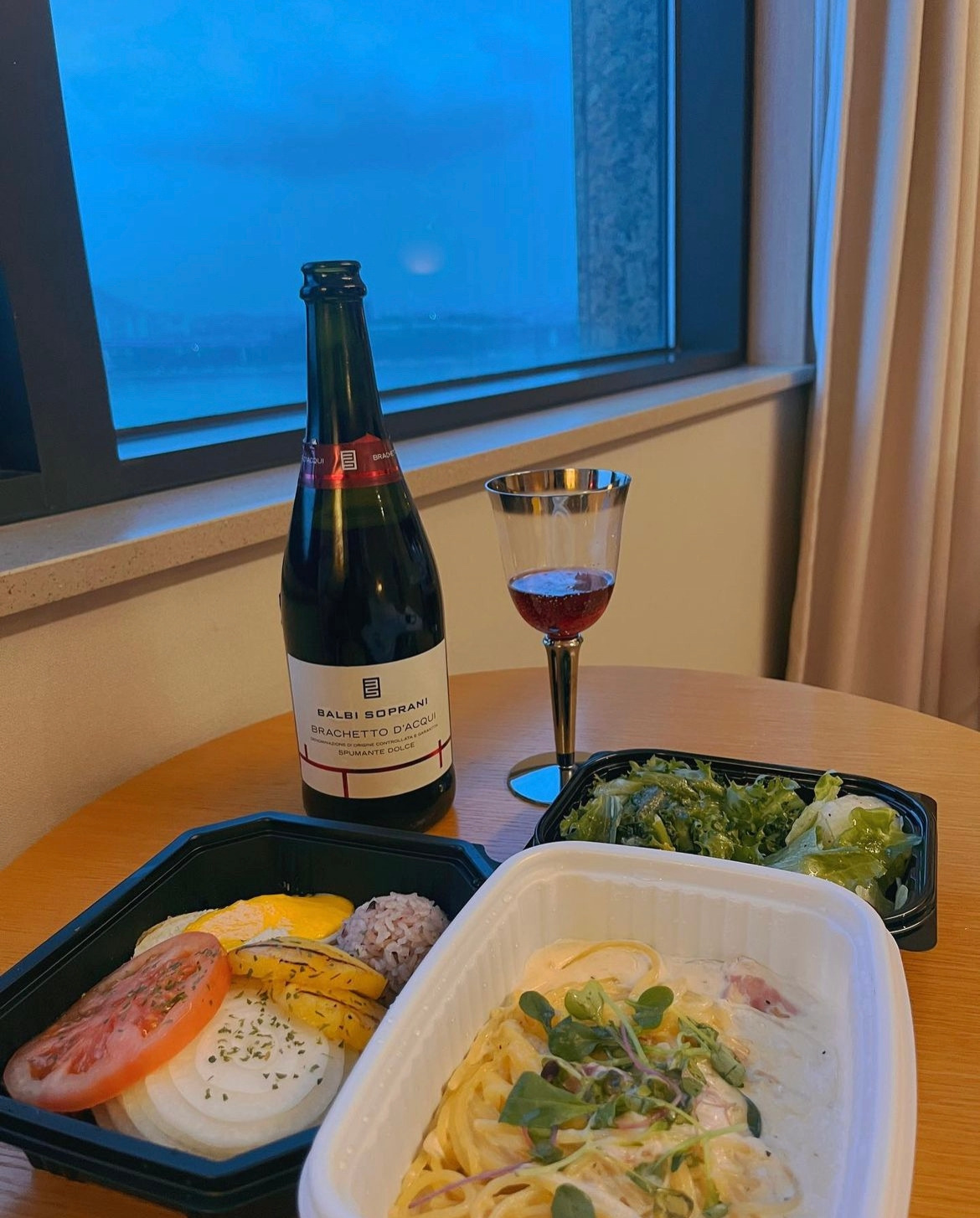호텔레스토랑에서 저녁 먹고 싶었는데 코로나 여파인지 운영을 하지 않아 동생이 사준 저녁에 편의점표 스파클링와인 사다가 바다를 보며 객실에서 맛있게 먹었다. 내륙에서 태어난 나는 쉽게 보이는 바다가 참 기껍다.