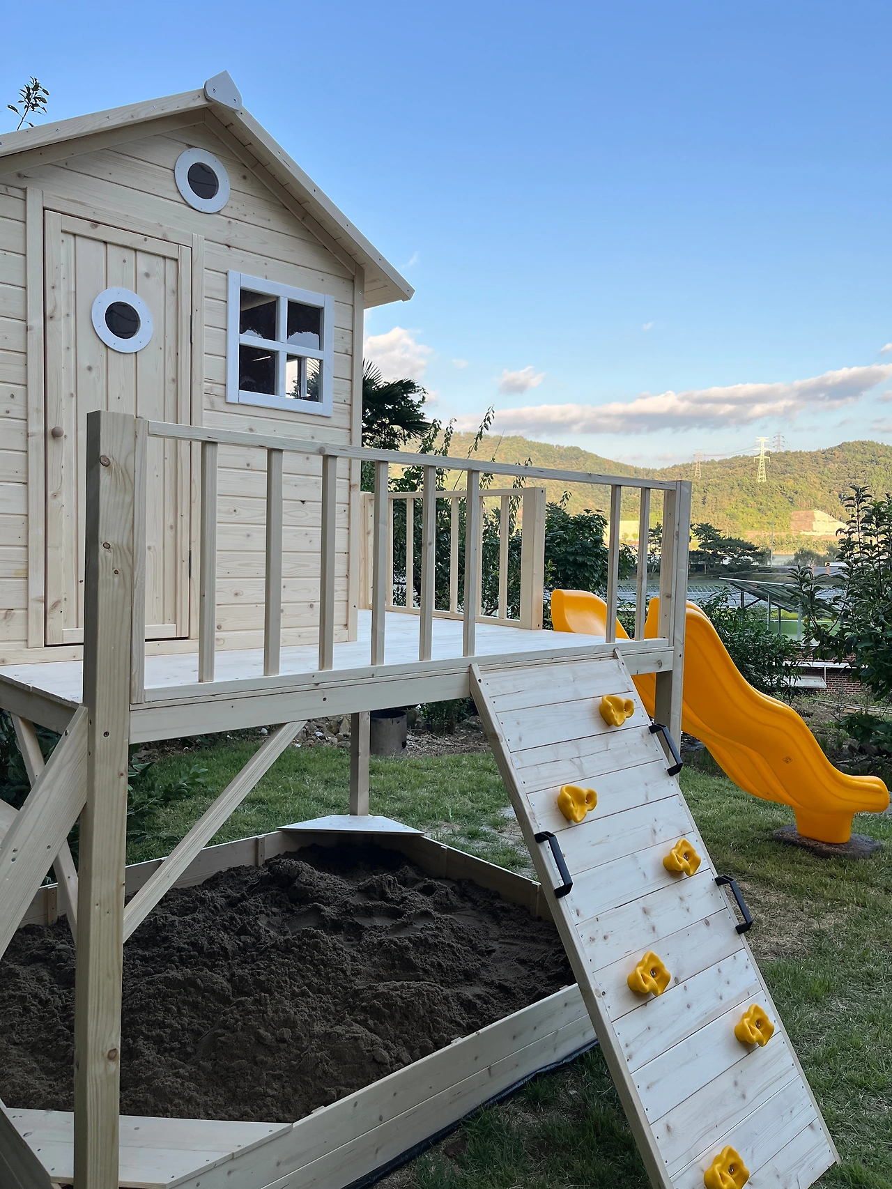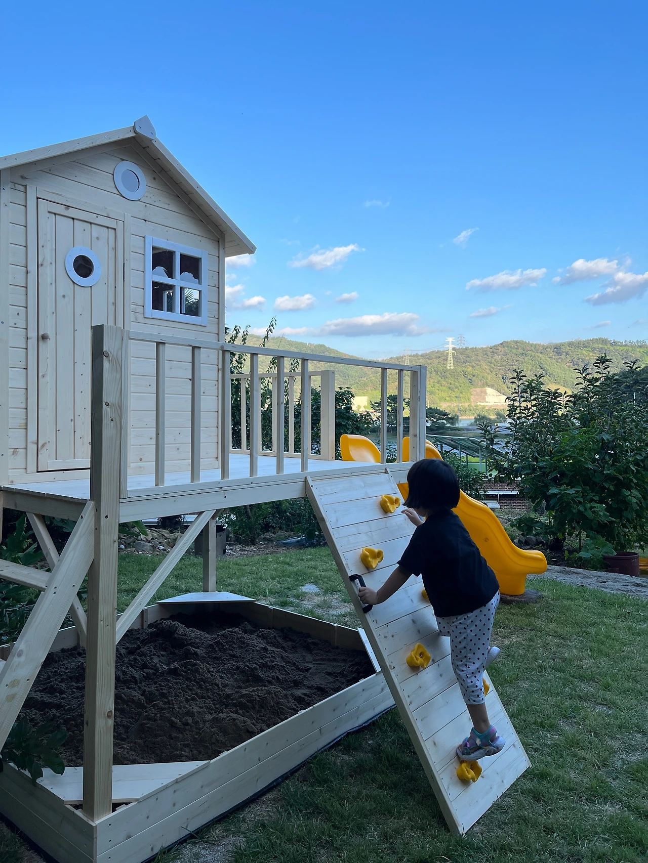 파란 가을 하늘에 푸르른 잔디밭. 그 위에 있는 모래 놀이터와 2층 오두막집. 기다란 노란 미끄럼틀.
