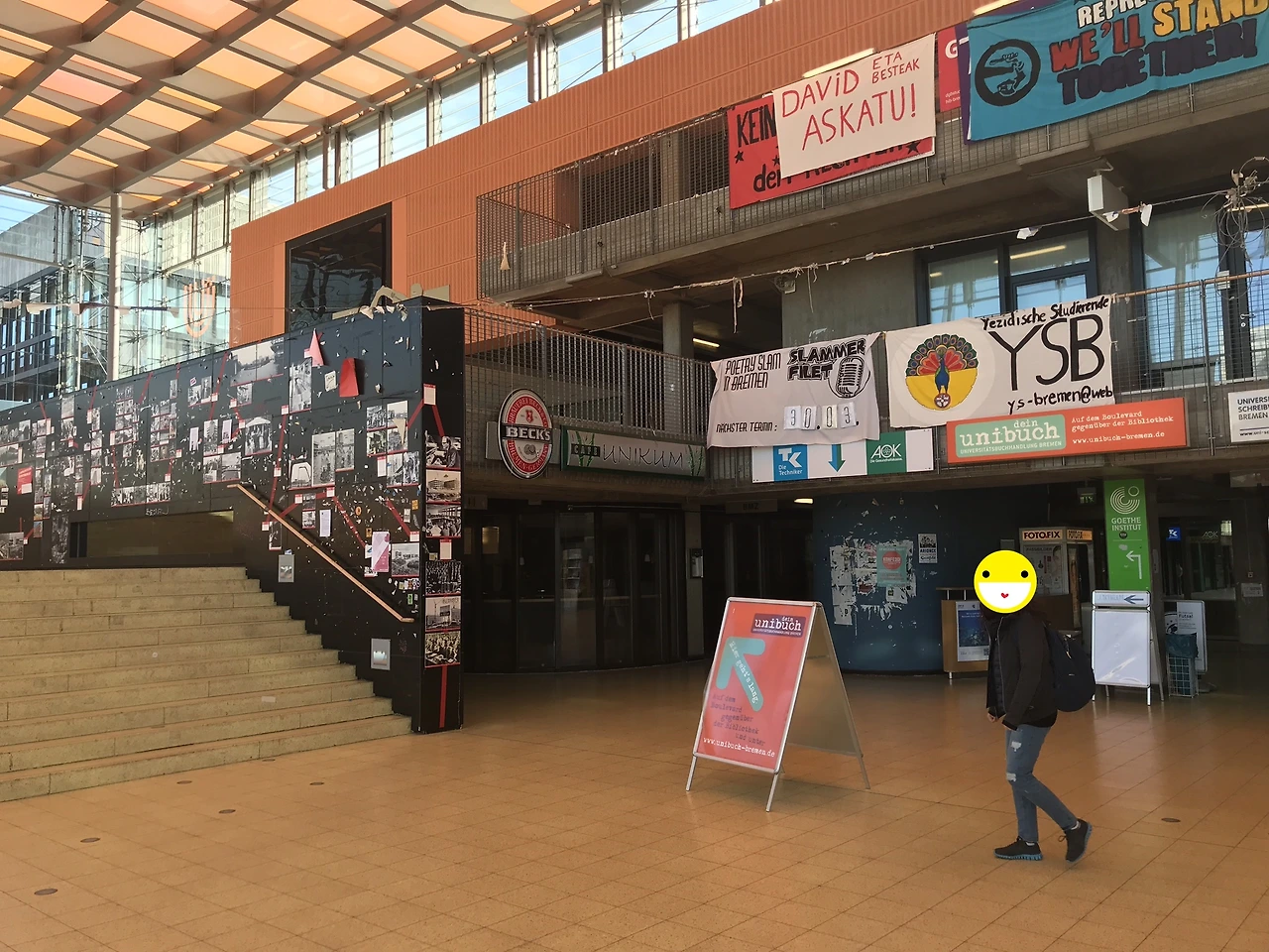 프라이부르크 대학이나 훔볼트 대학과는 완전히 다른 매력의 브레멘 대학교는 1971년에 세워진 '젊은' 대학이다. 통유리로 된 건물 입구 모습과 로비에 붙여진 알록달록한 현수막, 건물 안 스케치들이 젊은 에너지와 자유로운 분위기를 발산한다. 독일의 많은 대학이 그렇듯이 단과대별로 건물이 주변에 흩어져있는데 사진 속 이 건물이 도서관도 있고, 학생식당인 멘자(Mensa)도 있고, 행정업무도 볼 수 있는 메인 건물이라고 할 수 있다.