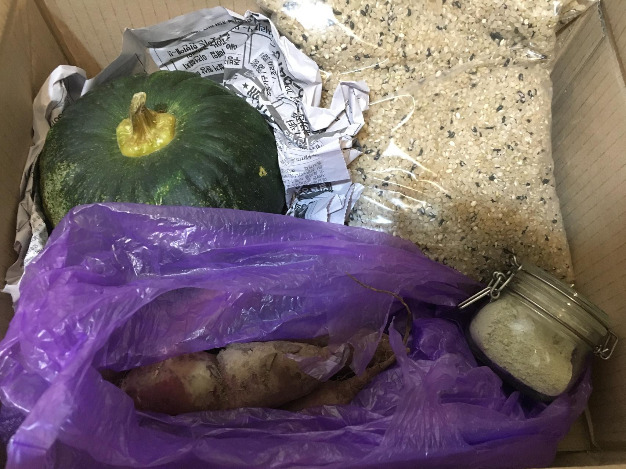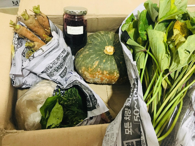 수많은 이웃과 친구의 도움으로 농사를 짓고 수확한 햅쌀과 가뭄에도 죽지 않고 열매를 맺은 고구마, 당근, 배추 등의 작물 외에도 긴병꽃풀이라는 여러해살이풀로 만든 연고, 로즈마리, 마조람을 말려 소금과 섞은 허브 솔트 등이 차분히 담겨있다. 상자를 열 때마다 한 해 여러 어려움 속에서도 이 꾸러미를 위해 수고했을 친구를 생각한다.