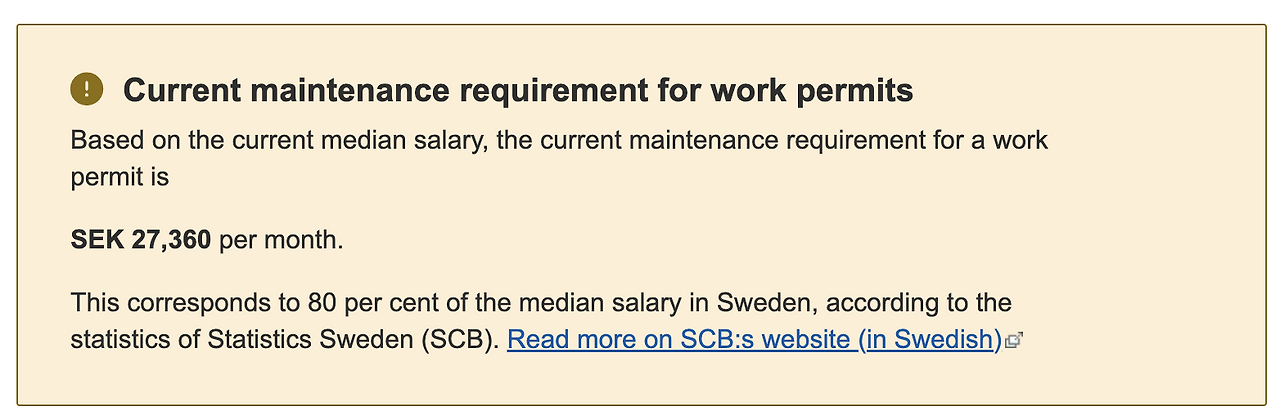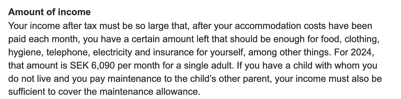 그리고 스웨덴 내에서 살다가 삼보비자를 받기 위한 최저 기준에서 볼 수 있듯, 1인가구 기준으로 세후 월급에서 의식주비용, 통신비, 보험 등등 기본 고정비용을 다 낸 후에 2024년 기준으로 매달 6090kr (76만원) 이 남아있어야 괜찮은 삶을 영위할 수 있다고 이민국은 생각한다. [2]