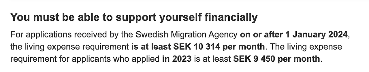 학생비자로 오는 경우를 생각해 보자. 어차피 1인가구이니 학생이나 직장인이나 필요한 생활비는 비슷하다고 가정하자. 2024년 기준 매달 최소 10314kr 가 필요하다. [3] 학생아파트의 경우 예테보리기준 4000-6000kr 이므로 대략 5000kr 정도로 나머지 비용을 해결해야 한다. 그럼 5000kr를 생활비라고 가정해 보자.
