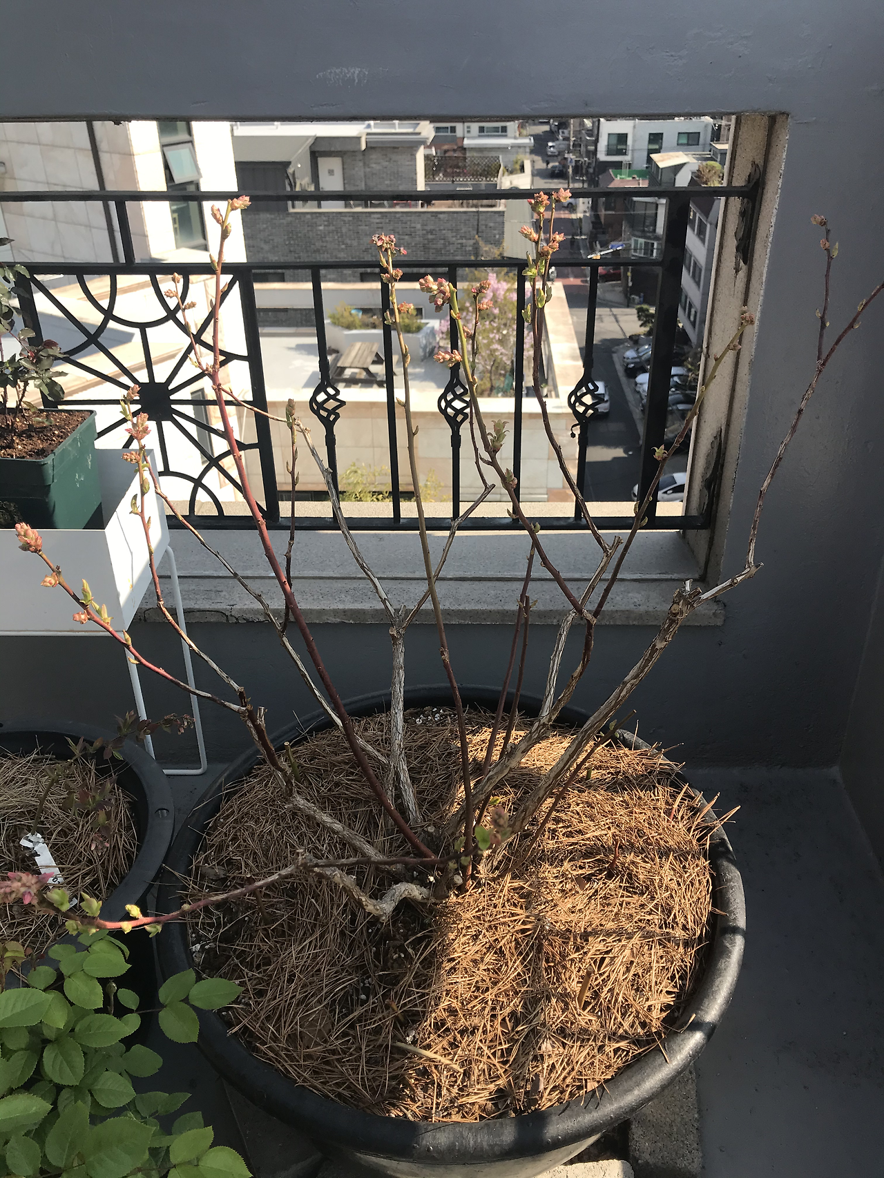 꼭 사고싶었던건 과실수였다. 앵두랑 대추랑 감을 따먹던 어린시절이 즐거웠다. 앙상한 나무에서 싹이 나고 잎이 나고 꽃이 피고 꽃이 떨어지고 그 자리에 과실이 열리는 기쁨을 선우에게 주고싶었다. 화분에 가둬키울수 있는 블루베리가 적당했다. 작은 나무는 키우고싶지 않았다. 블루베리는 품종이 다양했다. 챈들러를 선택했다. 나중에 열매가 500원짜리 동전만해 진다고 했다. 6년생 성목을 주문했다. 3년생을 사서 서서히 크게 키우는게 좋다는건 몰랐다. 블루베리는 관목형 나무였다. 하나의 뿌리에서 기둥과 가지가 나와 점점 두꺼워지는게 아니라 뿌리만 있으면 땅속에서 새로운 목대가 나오는것이었다. (장미도 그렇다) 오래된 나무는 뿌리가 너무 커져서 폐기를 하기도 한다고 했다 -_-; 매년 나무를 잘라주고 키우며 균형을 맞춰줘야 하는거다. 몰랐다. 사기전까지는.. 사기전에 공부를 자세히 했어야 했는데 마음이 급했다. 그래도 꽤 좋은 나무를 샀고 70센티 화분에 심었다. 아기올리브를 키웠던 경험을 살려 강하게 전정을 했다. 나무나 식물이나 원리는 같다. 통풍이 잘 되게 가지 잘라주기, 아픈 잎들은 따주기, 물주기이다. 적당히 잘라주면 남은 가지나 잎들이 더욱 튼튼하게 큰다. 공급되는 영양의 총량이 같으니 자잘하게 여기저기 분배시켜 키우는것보다 선별해서 강하게 키우는게 더 좋은것이다. 대부분의 식물은 말라죽는것보다 과습에 잘 죽는다. 과습 통풍 일조량만 지키면 식물은 잘 자란다. 대부분 집안에서 무언갈 키우기때문에 일조량과 통풍때문에 잘 죽는다. 해는 영향을 주고 바람은 식물을 강하게 한다.