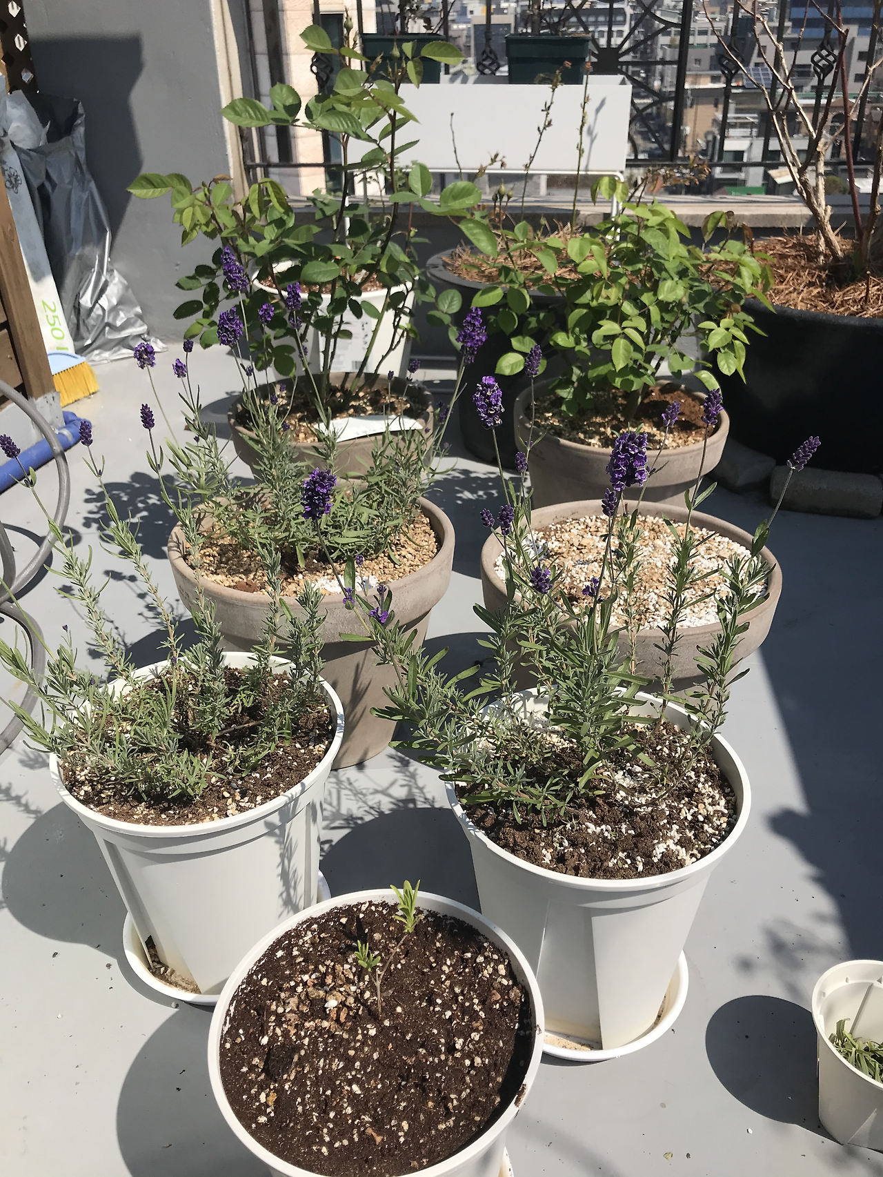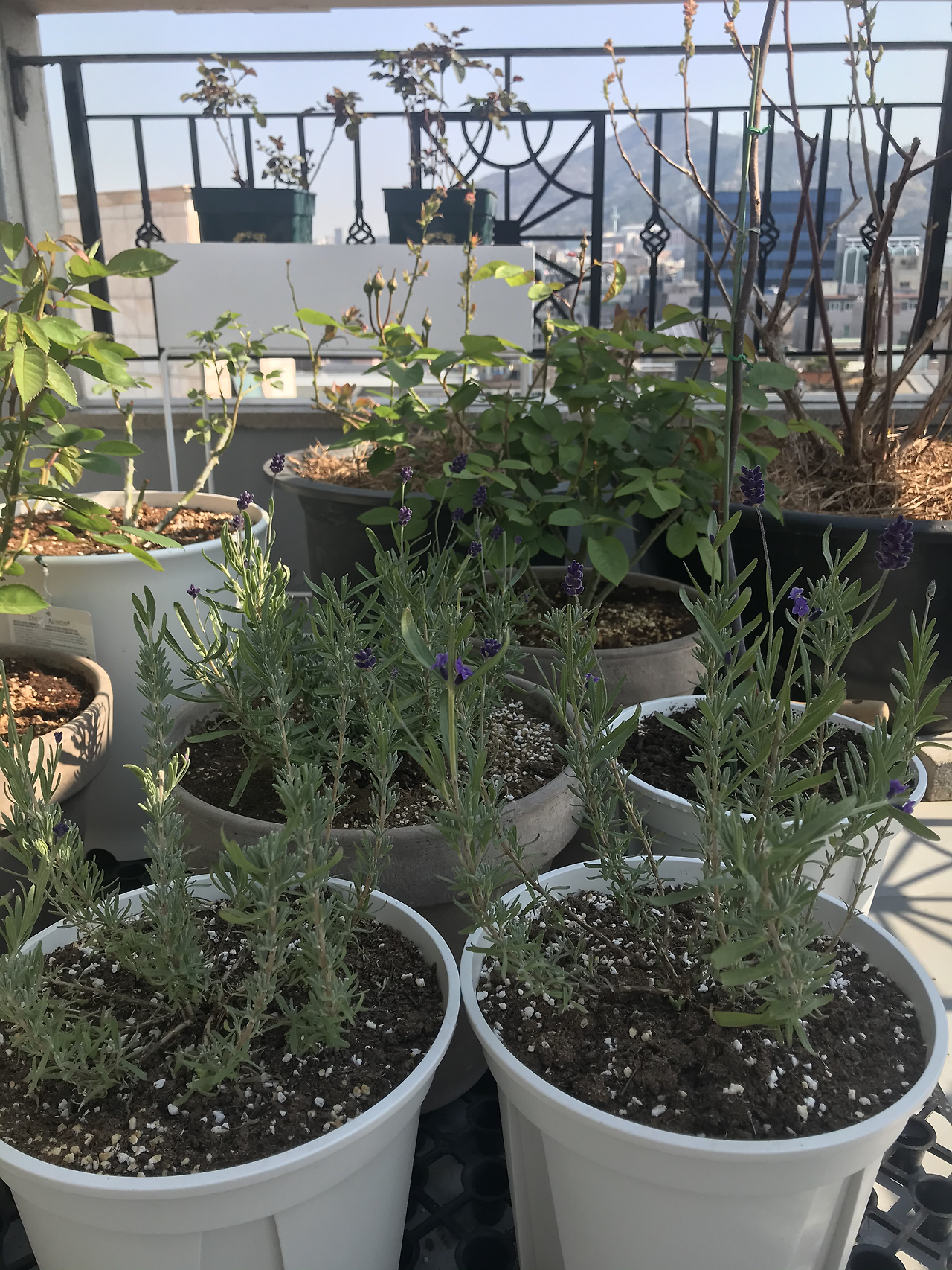 잉글리시라벤더는 남프랑스 여행을 하고 싶다고 생각한 순간부터 꿈꿨다. 보라보라 더미라니 하아. 너무 매력적이다. 군락을 이루고 핀 모습을 상상하며 우리집 옥상텃밭을 죄다 라벤더로 키워볼까 했지만.. 수확되는 채소를 심어야하는 주부마음.. 결국 실속이 로망을 이겼다. 어쨌튼, 수확하면 차로 마실수도 있다. 향기가 좋다. 뿌리식물이라 관리만 잘하면 넓게 퍼진다. 프랑스의 라벤더 밭 사진에 나오는 모습까지는 아니어도 장미와 어우러지면 더 아름다울것이다. 대부부분의 식물들은 4월부터 싹이 난다. 다년초 식물들도 그렇다. 3월까지는 죽은듯한 가지에서 새싹이 난다. 4월이다. 여기서 잎이 날까 싶었던 라벤더는 풍성해졌다. 그저 잎이. 누가 보면 저게 뭐야? 할수 있다. 나만 안다.