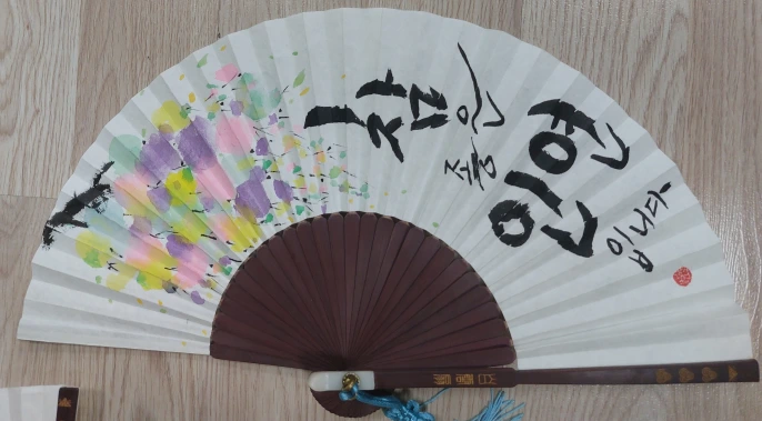 나는 '참 좋은 인연입니다.’ 라는 문구를 쓰고 흩날리는 예쁜 꽃을 그렸다. 먼저 색색깔로 물감을 묻혀 찍어 꽃을 표현하고 갈색으로 나뭇가지를 곳곳에 그려 넣었다. 그러고 나니 나름 만족하는 예쁜 부채가 완성되었다.