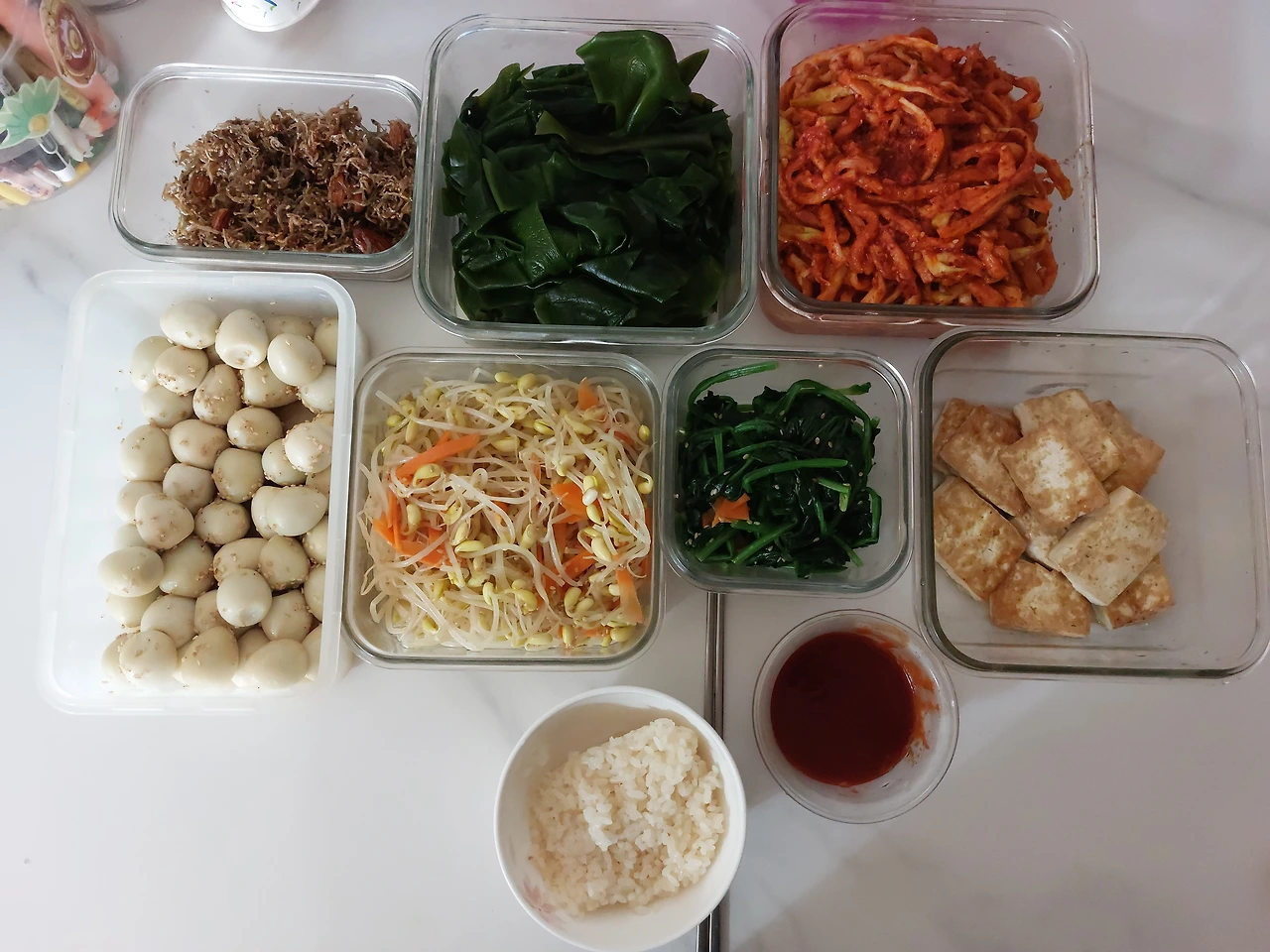 오늘은 외출하지 않은 주말이라 반찬을 만들었다. 내 머릿 속에 정리된 반찬은 메추리알 조림, 멸치볶음, 콩나물무침, 시금치 무침, 무말랭이 무침, 두부구이, 데친 다시마 였다. 총 7가지 이다.