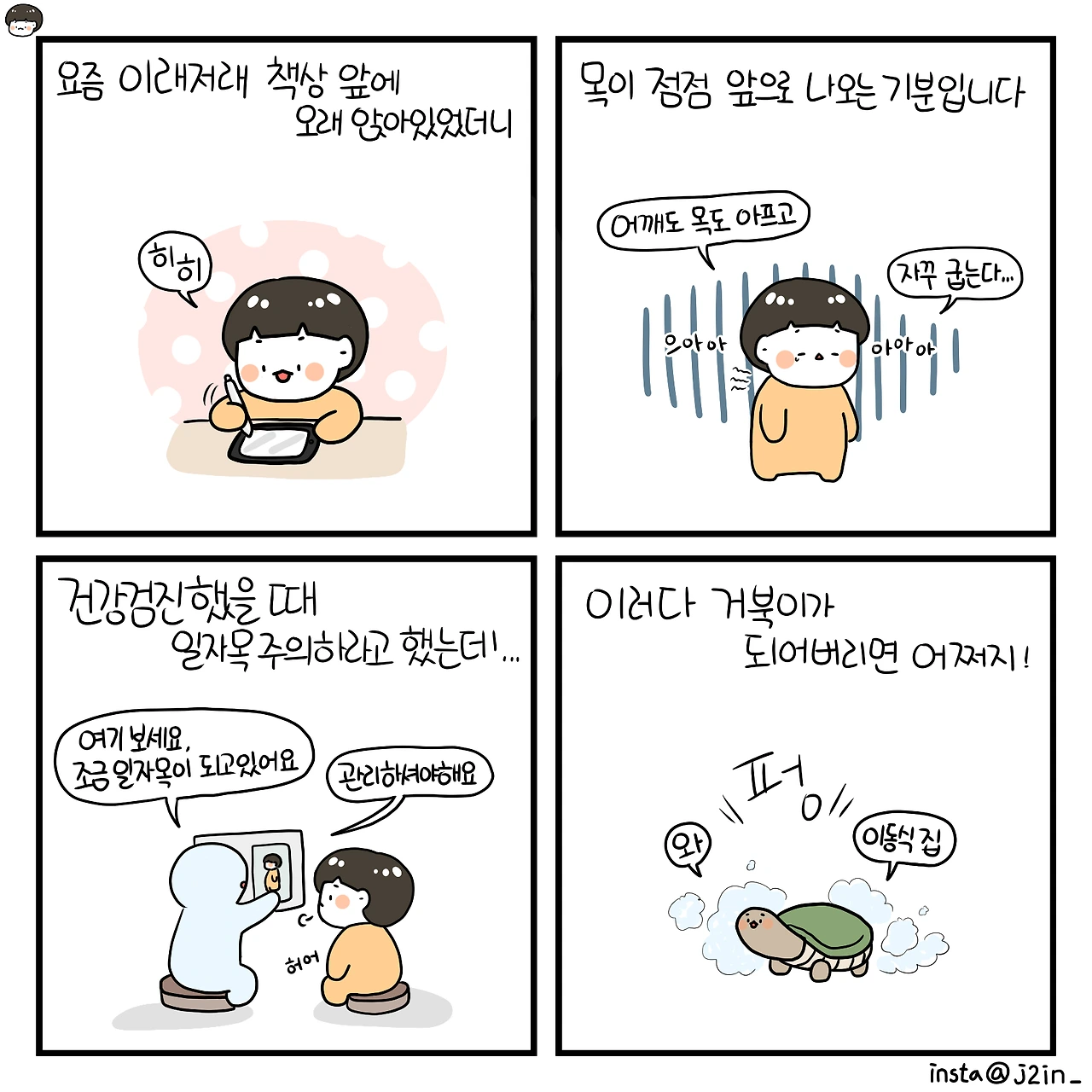 일자목 교정 스트레칭을 해야하는데, 자꾸 까먹는다. 거북이 되면 월세는 굳겠다!