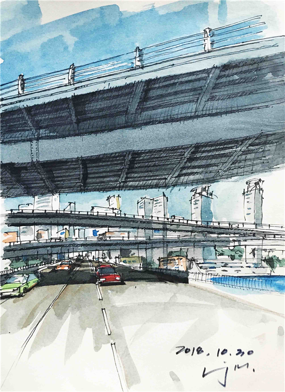 그래! 사람은 물론, 하물며 모든 사물의 이치가 그러하다. 들이긴 쉬우나 내보내긴 어려운 것. 도시를 그리면서 생각한다. 비워내야 할 것은 내 몸뿐만이 아니라 내가 발 디디고 있는 이 꽉 찬 도시의 명제이기도 함을 알겠다. 아~ 가벼워지기.