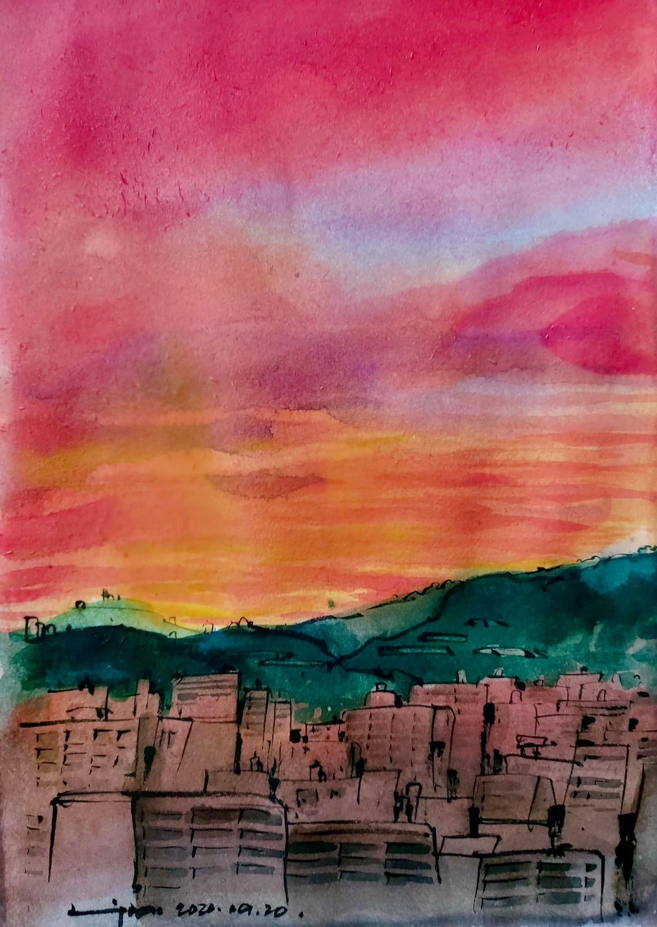 태양의 힘인지? 구름의 조화인지 모르겠다. 여느 낙조의 낭만적인 모습과는 분명 달라, 노랑보다는 짙고 붉은 기운이 훨씬 많다. 하기야 이 도시에 무슨 낭만적 낙조일까? 잠시이지만, 붉은 기운으로 세상을 잠재워 버릴듯 변화 또한 무쌍하다.