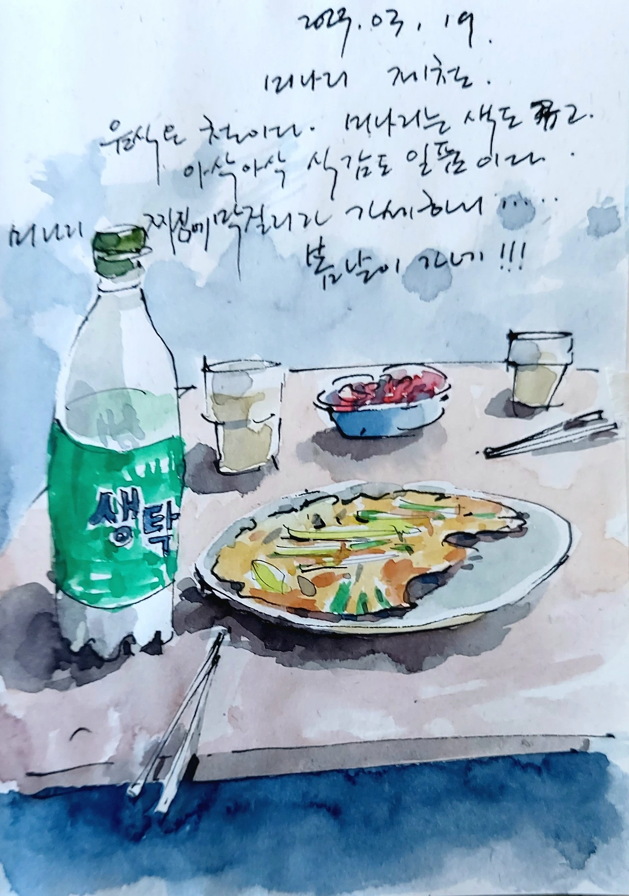 음식은 제철. 요즘 미나리는 연두빛 색도 곱고, 아삭아삭 식감도 일품이다. 아내가 만든 미나리 찌짐에, 염두에 둔 막걸리가 가세하니….머문듯 지나는듯, 봄날이 가네.