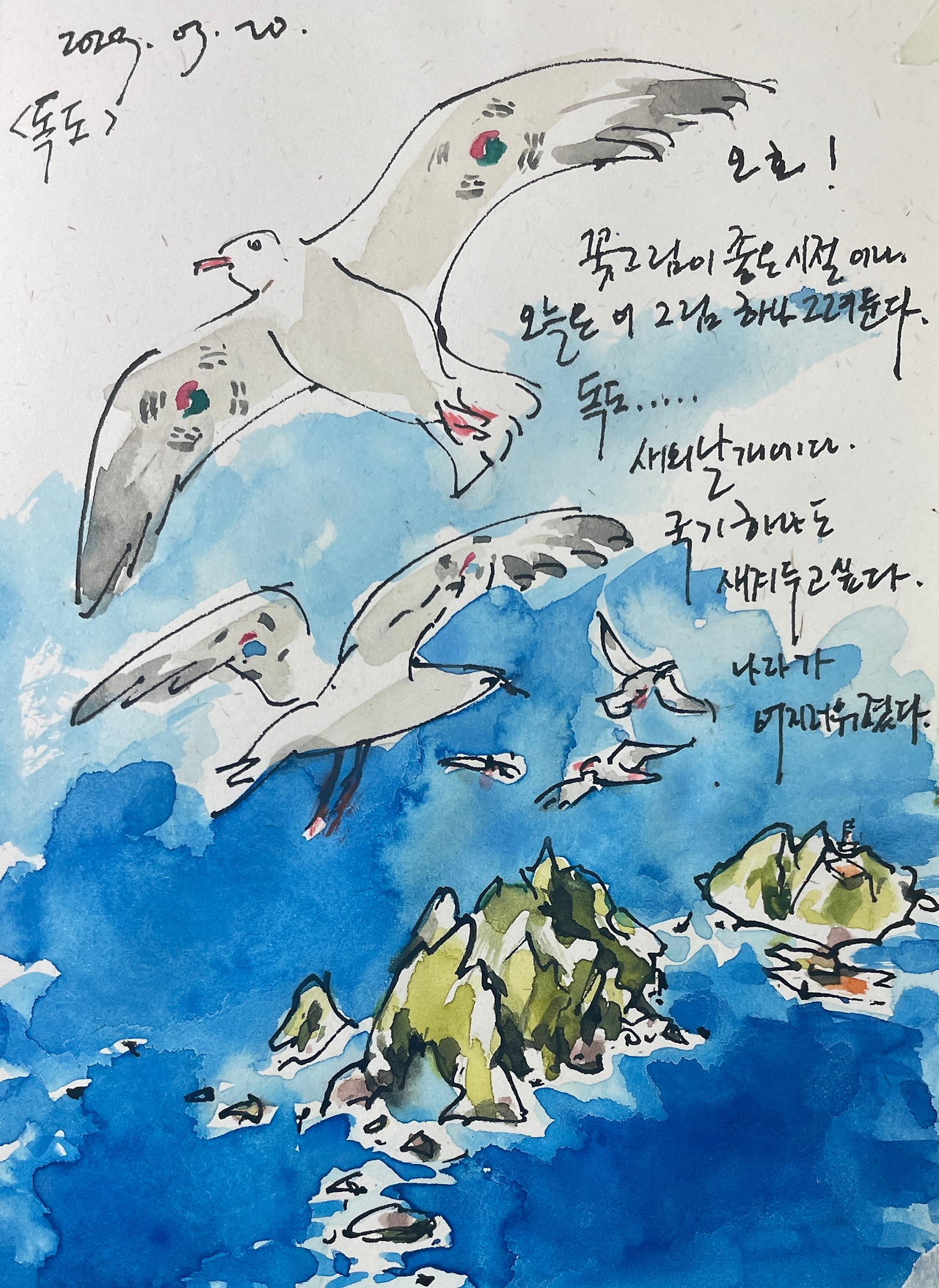 꽃 그림만 그려도 모자라는 계절인데. 오늘은 이 그림 하나 그려 두어야겠다. 하물며 새의 날개에 태극기 하나라도 새겨 두고 싶다. 이 또한 우리 새다. 아~ 또다시 외로워 지려는 독도. 내 일기장에 꼭꼭 새겨 둔다.
