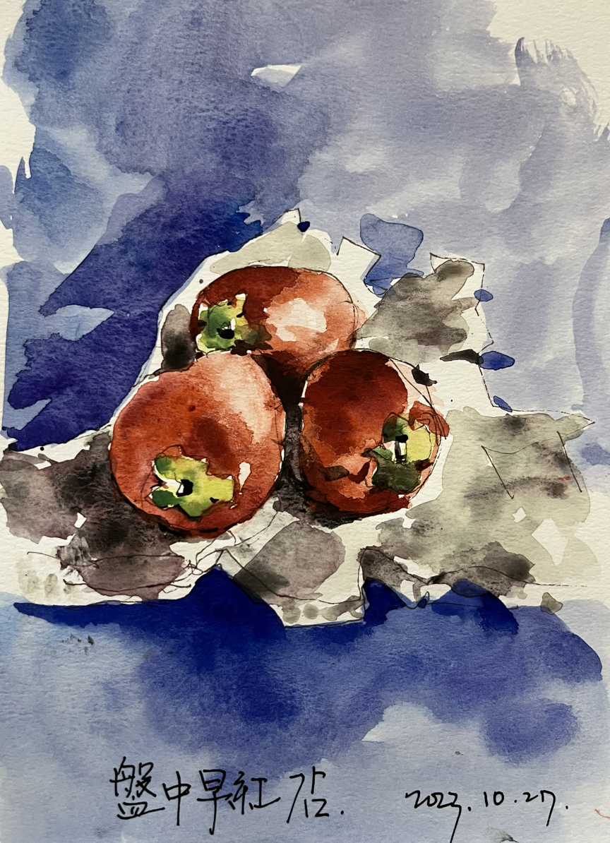 박인로가 한음(이덕형)으로부터 감 한 소쿠리를 받고, 부모님을 그리워한 시조이다. 시절에 홍시 세 알을 그리면서, 나도 시인의 마음이 된다. 홍시처럼 투명했던 어머니의 부드럽던 볼과. 한 알도 버리지 않고 거두어, 우리가 가면 화악 풀어 놓으시던 아버지의 거친 손등. 그 아련한 것들을 그린다.