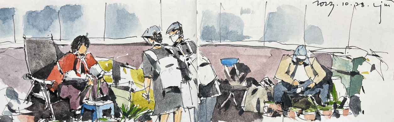어느 건물 모퉁이에 서서 잠시 계절을 잊은 나는 사람을 그리고, 사람들은 그러한 나에게 조금도 관심이 없으니 초상권 시비는 걸리지 않지 싶다. 쉬임 없이 지나가는 사람들. 동 시간에 머물지 않은 이름 모를 사람들을 한 화면에 그린다. 11시 10분의 사람, 11시 20분의 사람, 11시 25분의 사람……