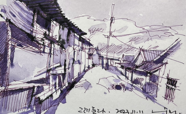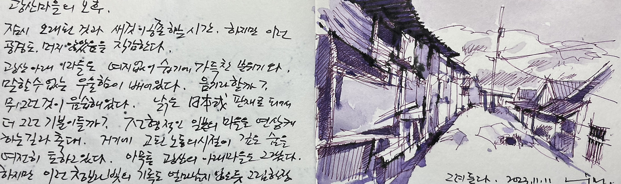 문득 찾아간 일광 달음산 아래의 광산마을. 여기 저기서 개발의 바람이 선듯 이니, 이런 청보라빛 기록도 얼마 남지 않았을게다. 기억이란 시간 속에 숨는 것이다. 아쉬운 마음에 그림 한 장 그려 둔다.