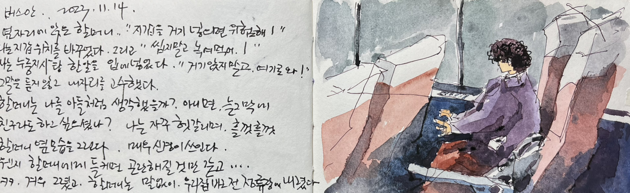 손과 펜을 숨겨 가며 겨우 한 장을 그렸고, 할머니는 우리집 바로 전 정류장에 내리셨다. 할머니는 나의 존재를 잊은 듯, 이번엔 내게 눈길 조차 주지 않았다. 아무튼.